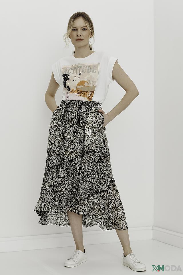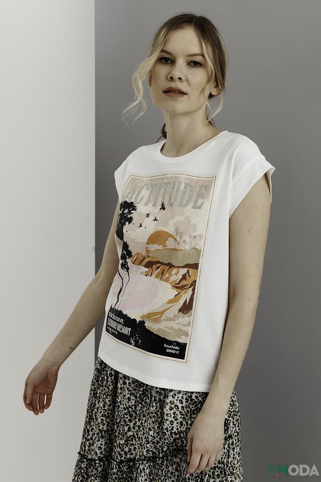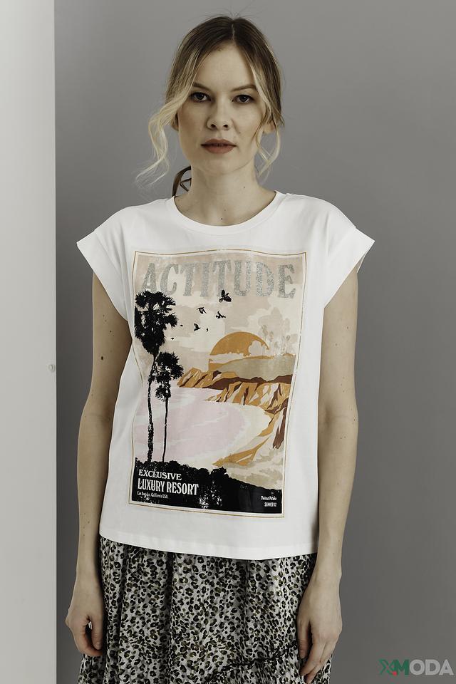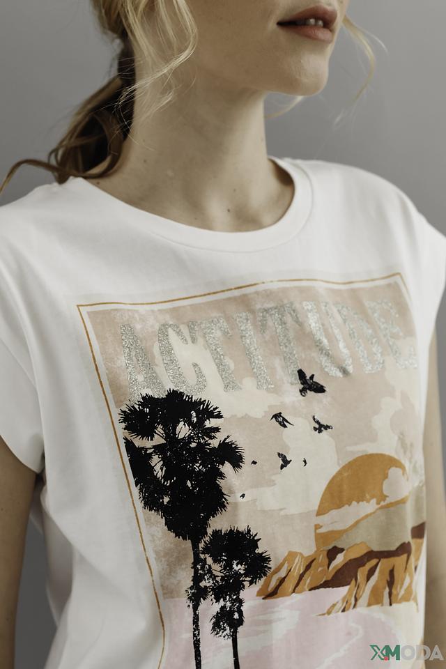 Особенностью данной модели является яркий и запоминающийся принт "Attitude" с изображением пальм, гор и надписью. Принт выполнен в оранжево-коричневой гамме, что добавляет футболке летнее настроение.