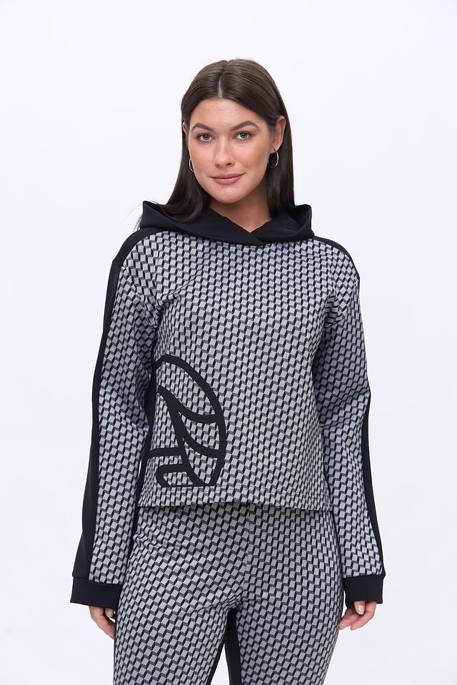 Женский пуловер Ulli Ehrlich Sportalm чёрного цвета с оригинальным геометрическим принтом и капюшоном. Модель выполнена из мягкого и эластичного материала, обеспечивающего комфорт и свободу движений. Состав: полиамид 86%, эластан 14%