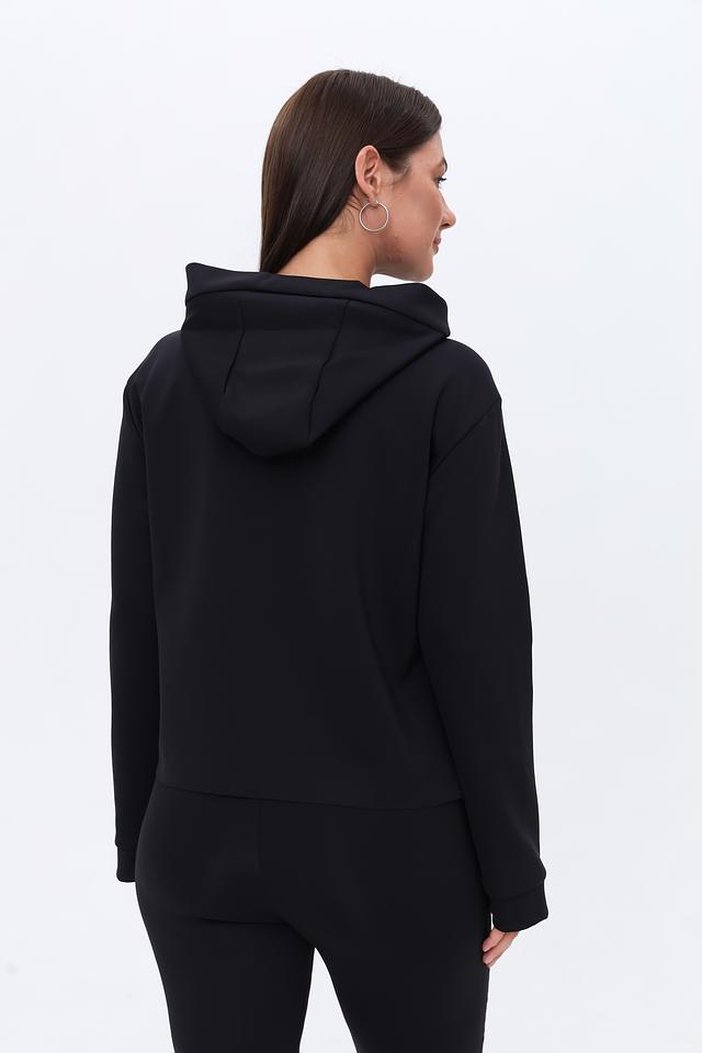 Модель имеет удобный капюшон и длинные рукава, а также слегка заниженную линию плеч, что обеспечивает комфортную посадку по фигуре. Пуловер изготовлен из высококачественного материала, сочетающего в себе 86% полиамида и 14% эластана, благодаря чему он отлично сохраняет форму, не мнется и быстро сохнет.
