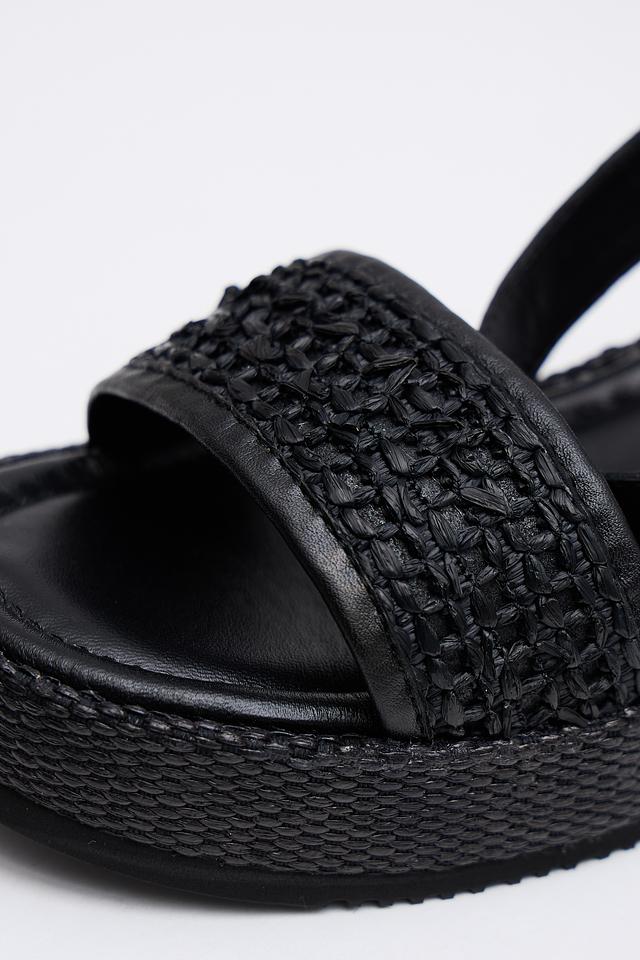 Сандалии имеют удобную платформу и ремешок с золотистой пряжкой, что обеспечивает надежную фиксацию на ноге. Верхняя часть сандалий выполнена из плетеного текстиля, а внутренняя подкладка – из натуральной кожи, что гарантирует комфорт даже в жаркую погоду.