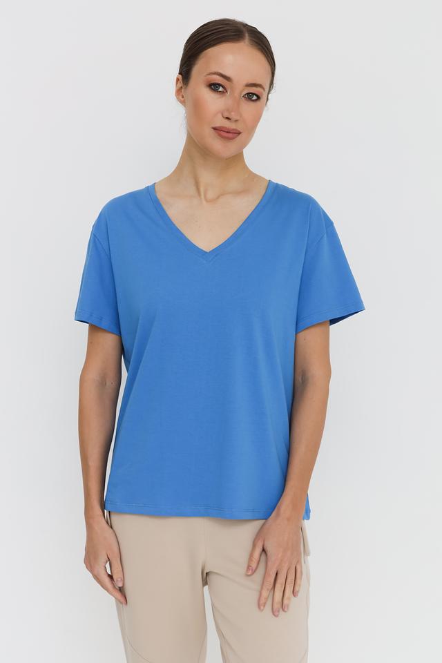 Женская футболка UNQ голубого цвета с V-образным вырезом. Изготовлена из 100% хлопка, обеспечивающего комфорт и воздухопроницаемость. Эта базовая футболка станет отличным дополнением к вашему гардеробу. Состав: хлопок 100%