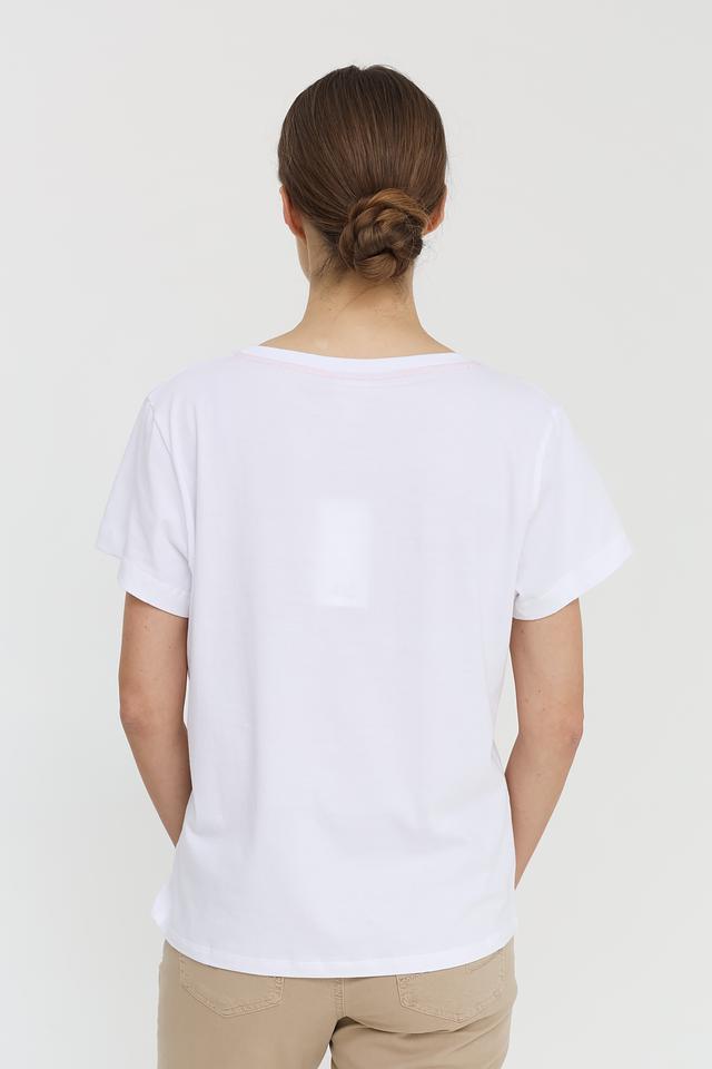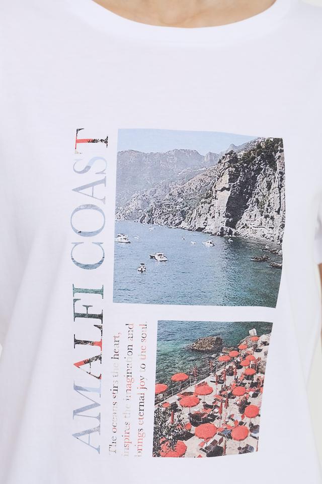 Женская футболка UNQ белого цвета с ярким принтом Amalfi Coast. Модель выполнена из 100% хлопка, обеспечивая комфорт и воздухопроницаемость. Стильный принт добавит образу легкости и свежести. Состав: хлопок 100%