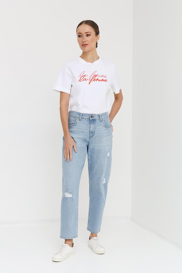 Джинсы имеют свободный крой, который обеспечивает комфорт и свободу движений. Декоративные рваности придают им современный и непринужденный вид. Высокая посадка подчеркивает талию и визуально удлиняет ноги.