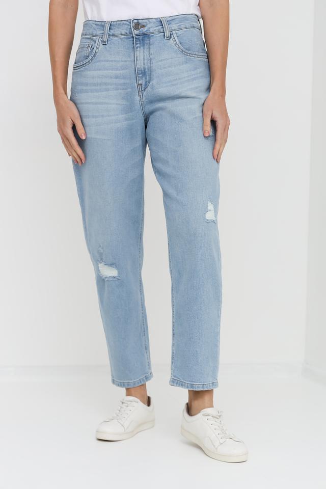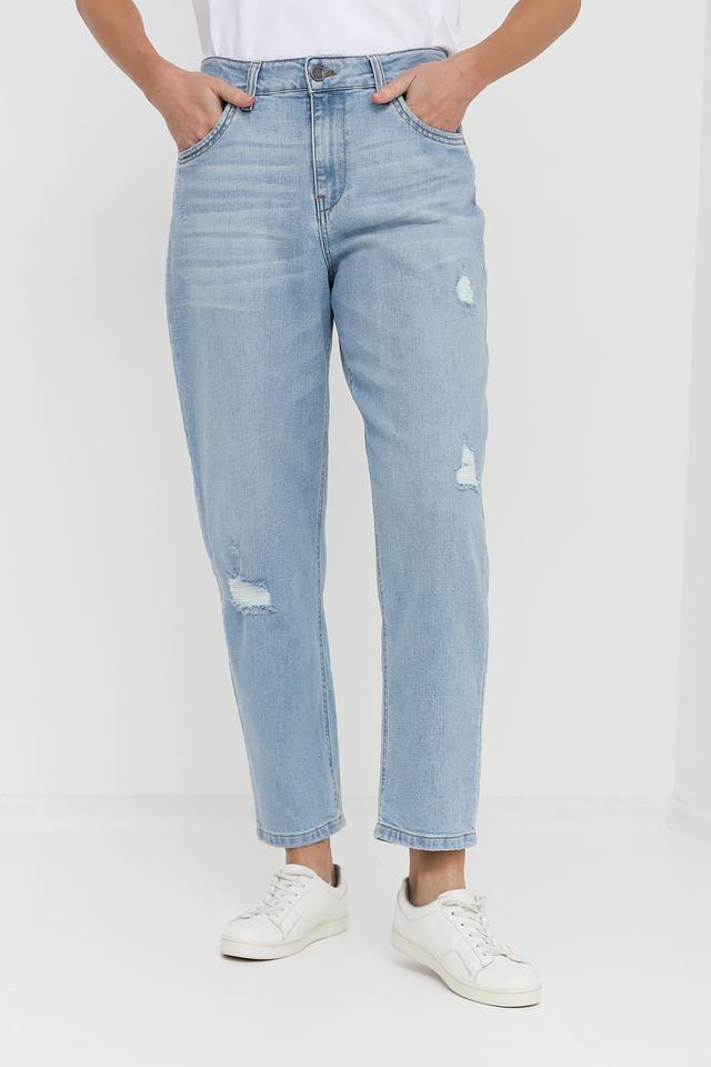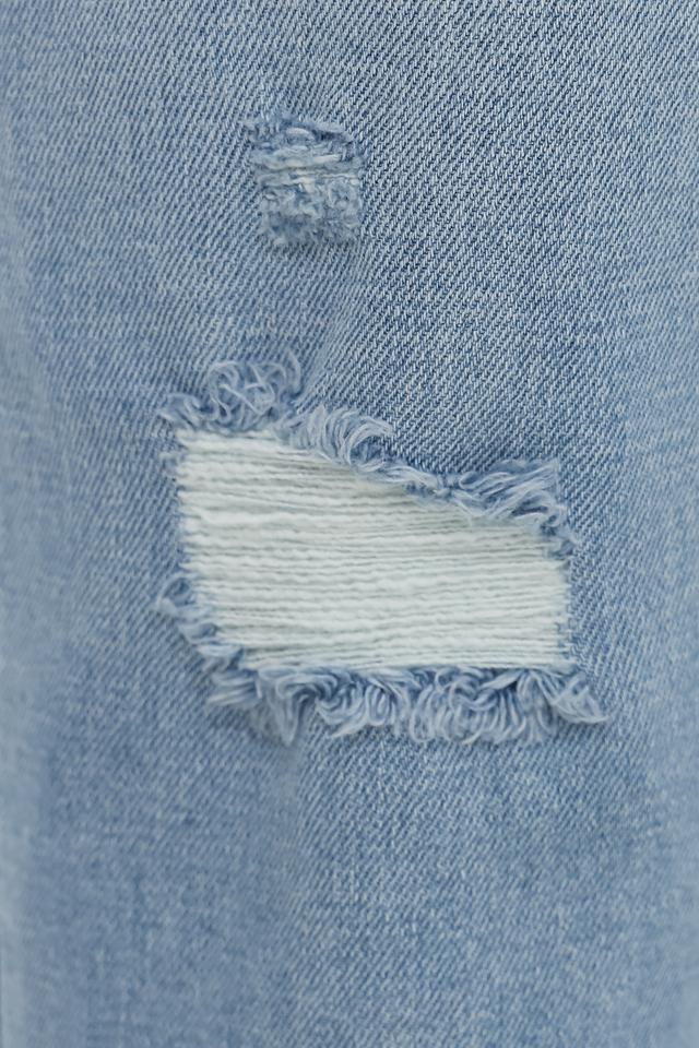 Женские джинсы UNQ голубого цвета в свободном крое с эффектными рваностями. Модель выполнена из качественного хлопка с добавлением эластана для комфорта и свободы движений. Состав: хлопок 98%, эластан 2%