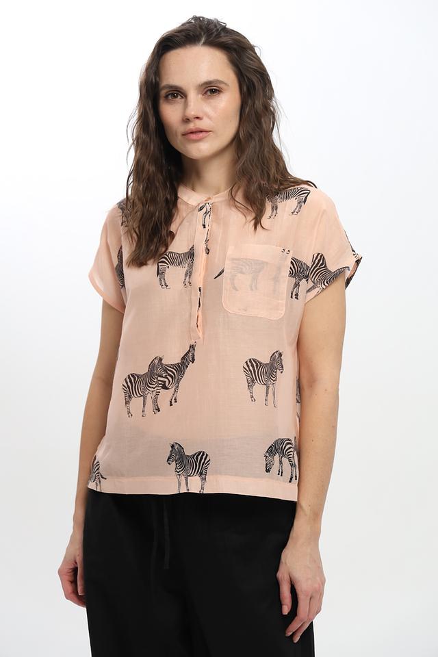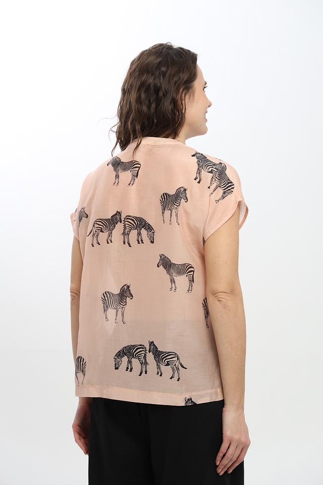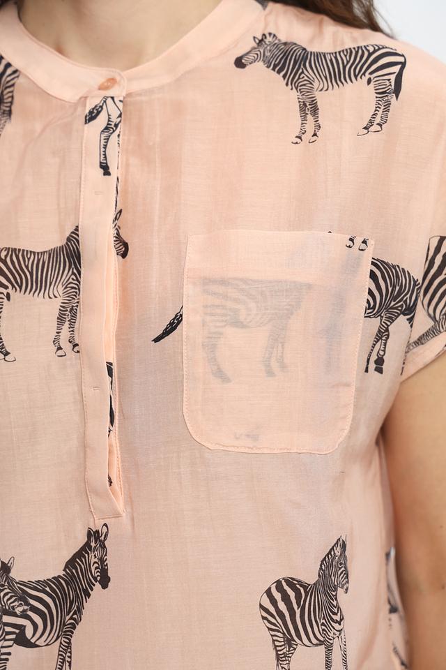 Персиковая блуза UNQ с принтом зебр – лёгкая и стильная модель из вискозы и шёлка. Блуза имеет короткий рукав-фонарик и удобный крой, идеально подходящий для создания повседневных образов. Состав: вискоза 80%, шелк 20%