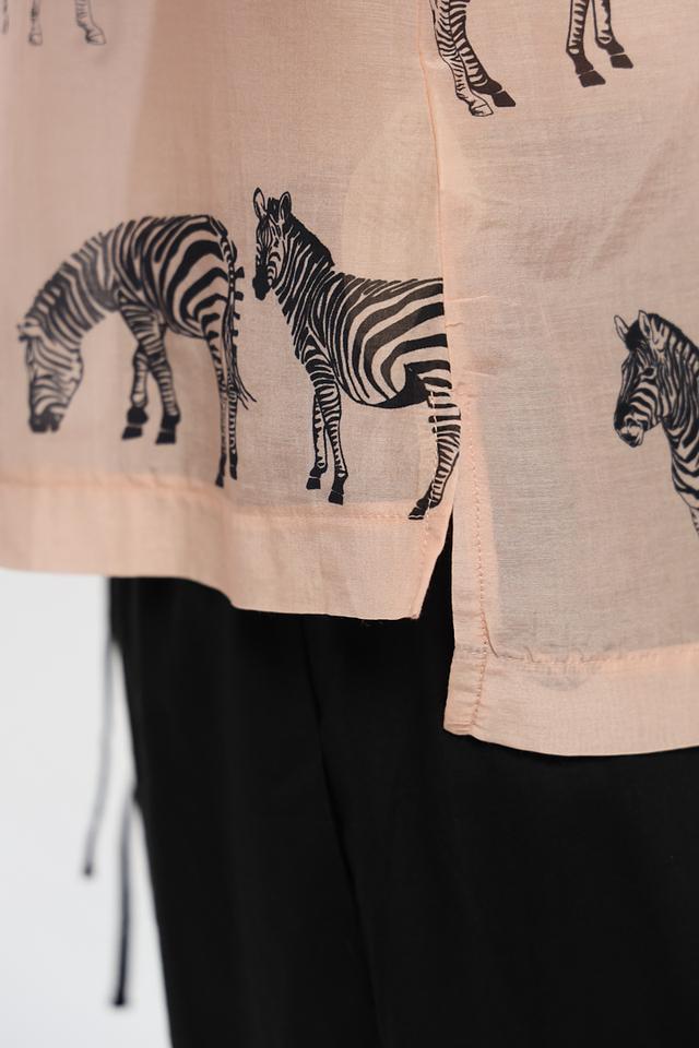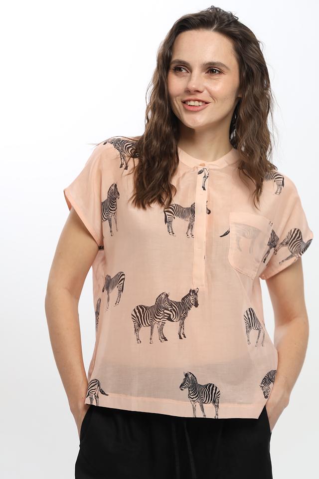 Эта блуза от UNQ выполнена в нежном персиковом цвете и украшена ярким принтом зебр. Модель имеет свободный крой, который обеспечивает комфорт в носке, а короткие рукава-фонарики добавляют образу лёгкости и женственности.