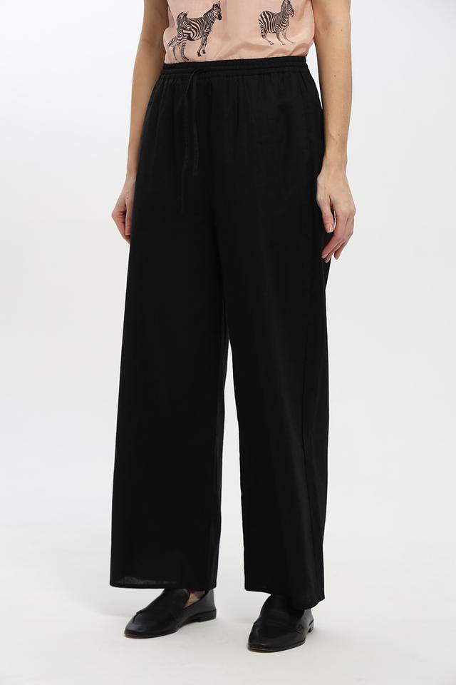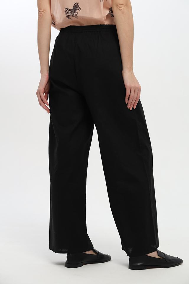 Чёрные брюки от UNQ широкого кроя — это стильное и комфортное решение для создания повседневных образов. Модель выполнена из льна и хлопка, имеет эластичный пояс и свободный силуэт. Состав: лен 55%, хлопок 45%