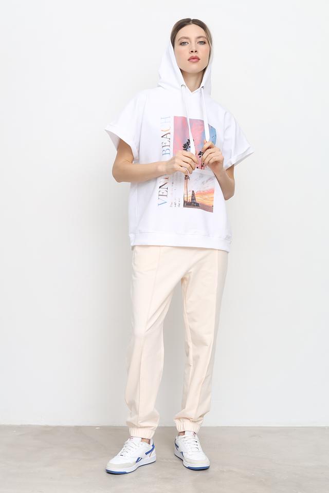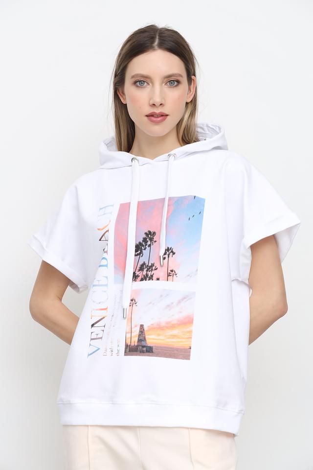 Белая толстовка от UNQ с ярким принтом Venice Beach. Модель выполнена из мягкого хлопка с добавлением эластана, имеет свободный крой и короткие рукава. Состав: хлопок 95%, эластан 5%