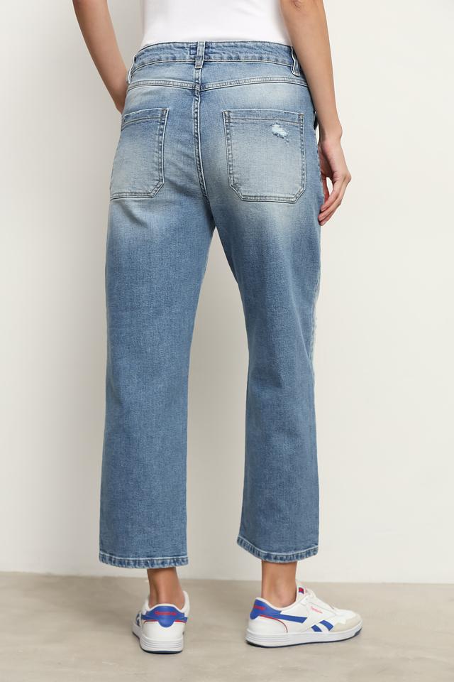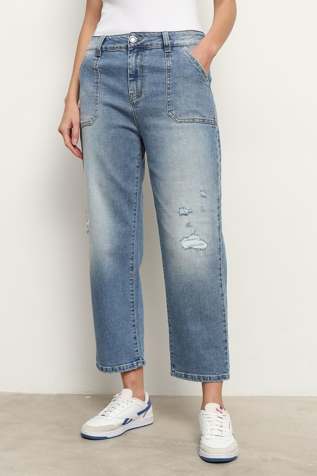 Женские джинсы UNQ голубого цвета с широкими штанинами и накладными карманами. Модель выполнена в стиле casual с эффектом потертости и имеет удобную посадку. Состав: хлопок 98%, эластан 2%