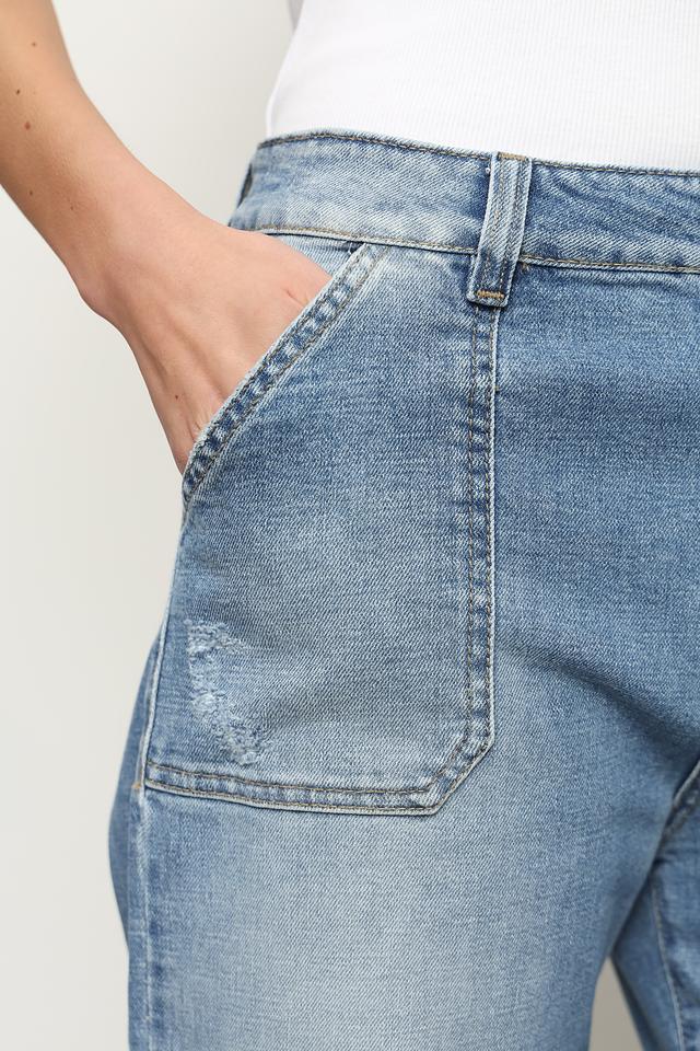 Джинсы имеют широкие штанины, что обеспечивает комфорт и свободу движений. Накладные карманы добавляют практичности и оригинальности дизайну. Эффект потертости придает джинсам непринужденный и стильный вид.