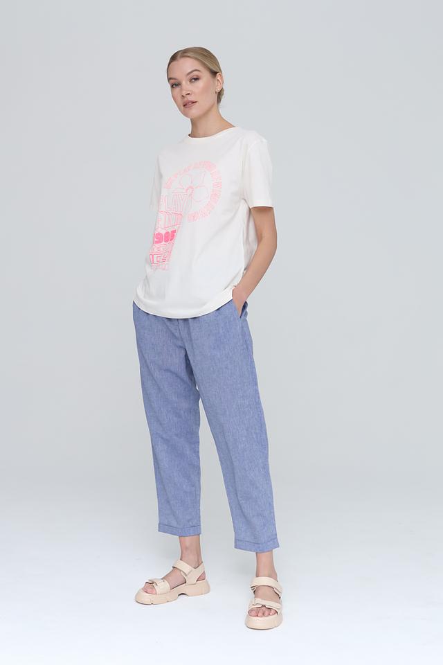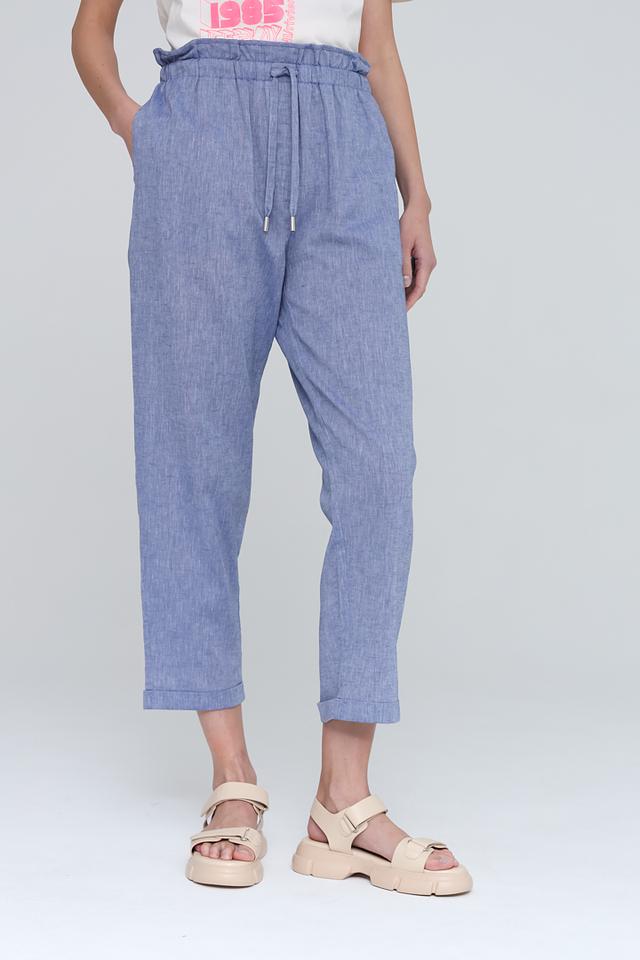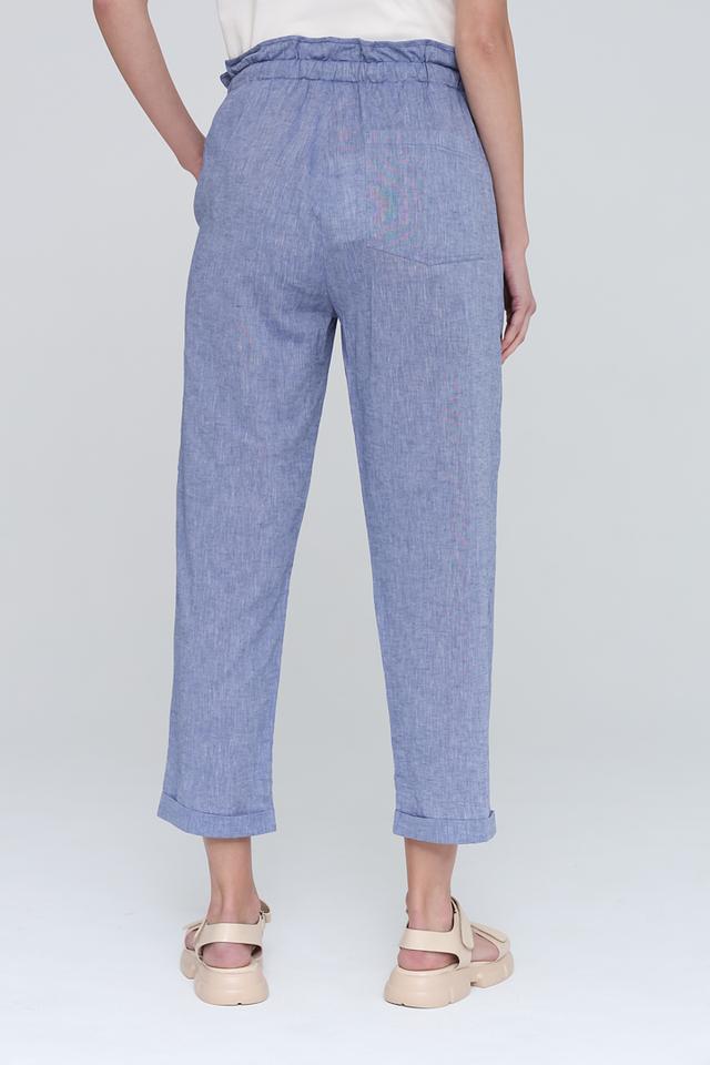 Женские брюки UNQ голубого цвета выполнены из натурального льна с добавлением хлопка. Модель имеет завышенную талию, эластичный пояс с кулиской и укороченный крой. Состав: лен 55%, хлопок 45%