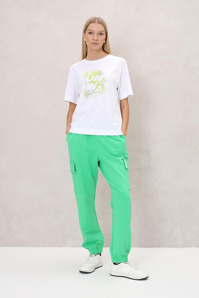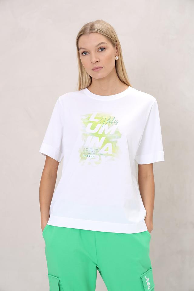 Особенностью данной модели является яркий и оригинальный принт с надписями и графическими элементами. Принт выполнен в светло-зеленых и серых тонах, что придает футболке современный и стильный вид.