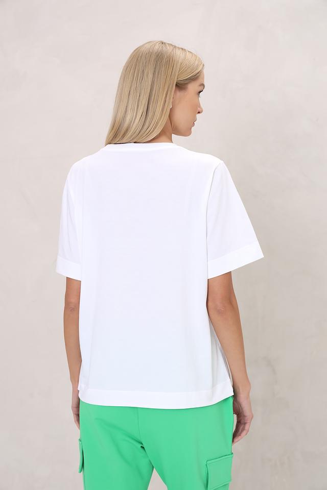 Футболка имеет прямой крой, короткие рукава и круглый вырез горловины. Она прекрасно сочетается с джинсами, шортами, юбками и другими элементами одежды. Это универсальная вещь, которую можно носить как самостоятельно, так и под жакет или кардиган.