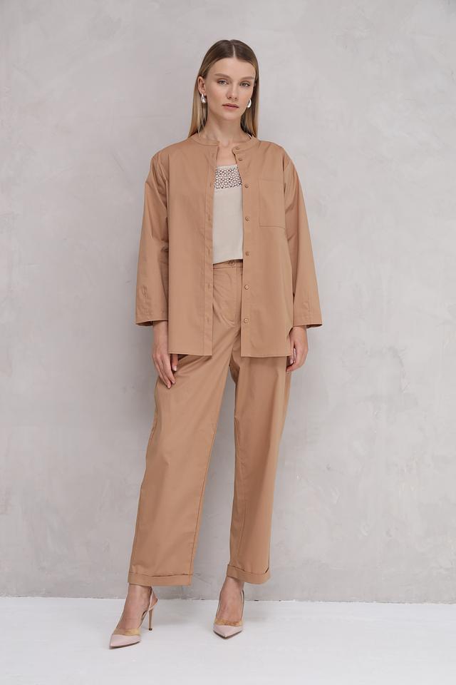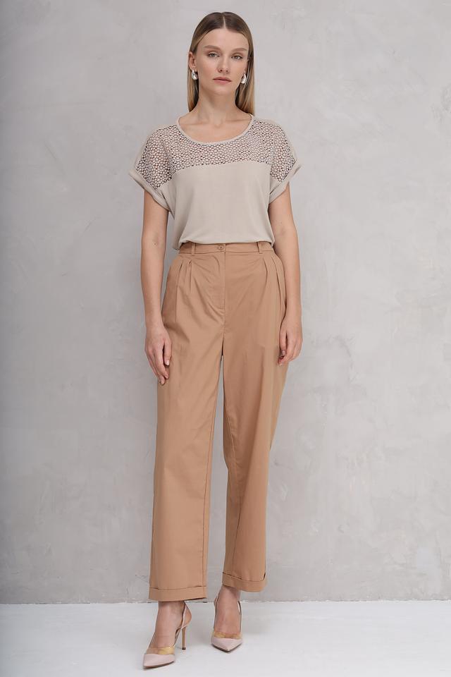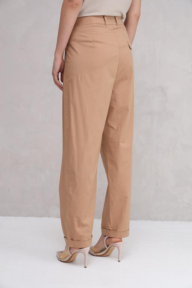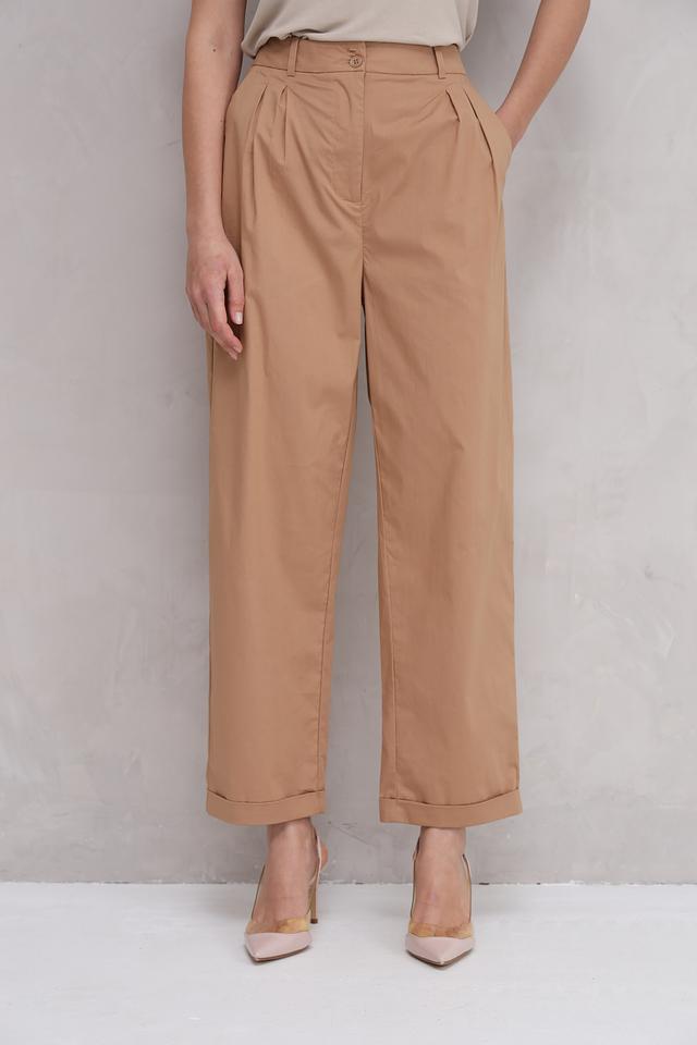 Классический крой с высокой посадкой и широкими штанинами обеспечивает комфорт и свободу движений. Пояс с защипами добавляет элегантности и подчеркивает талию. Брюки застегиваются на молнию и пуговицу.