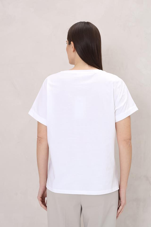 Футболка имеет прямой крой, который подходит для любой фигуры. Короткий рукав и классический круглый вырез делают ее универсальной и легко сочетаемой с другими элементами гардероба.