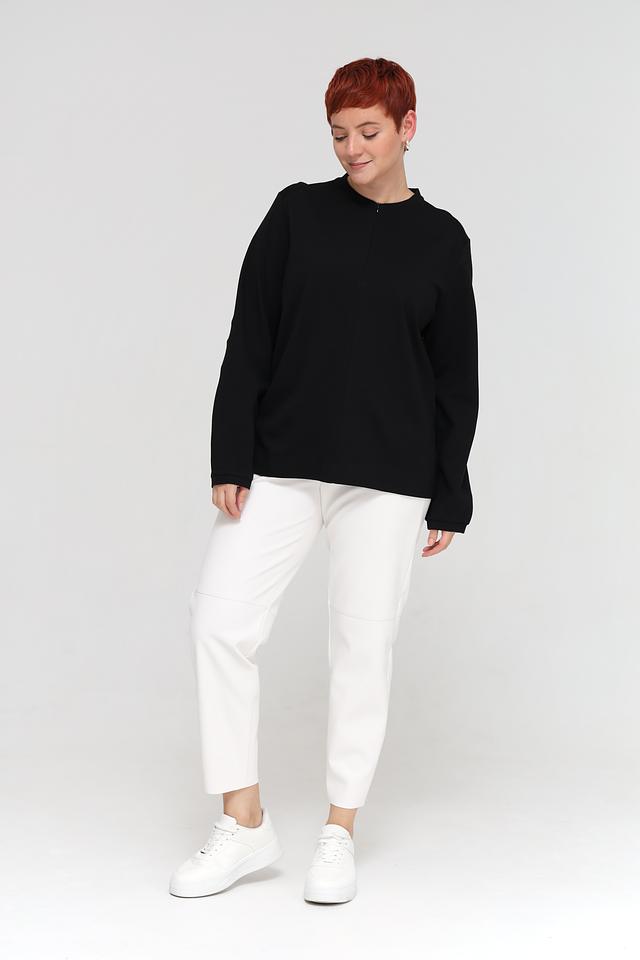 Блуза имеет прямой крой и длинные рукава, что делает ее универсальной для любого времени года. Особенностью модели является небольшая молния в области горловины, которая добавляет изюминку и позволяет регулировать степень открытости.