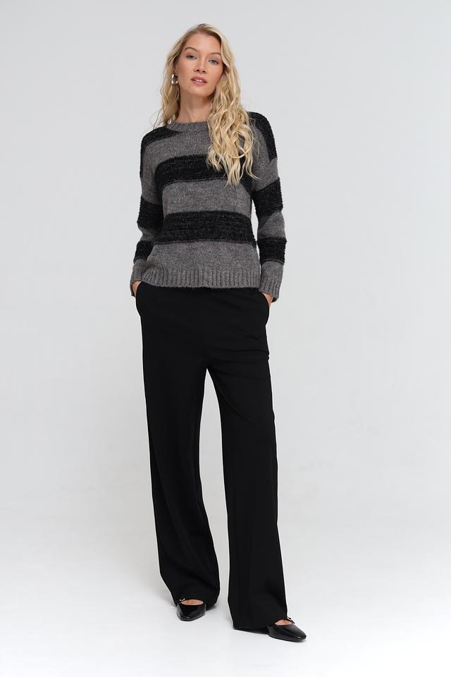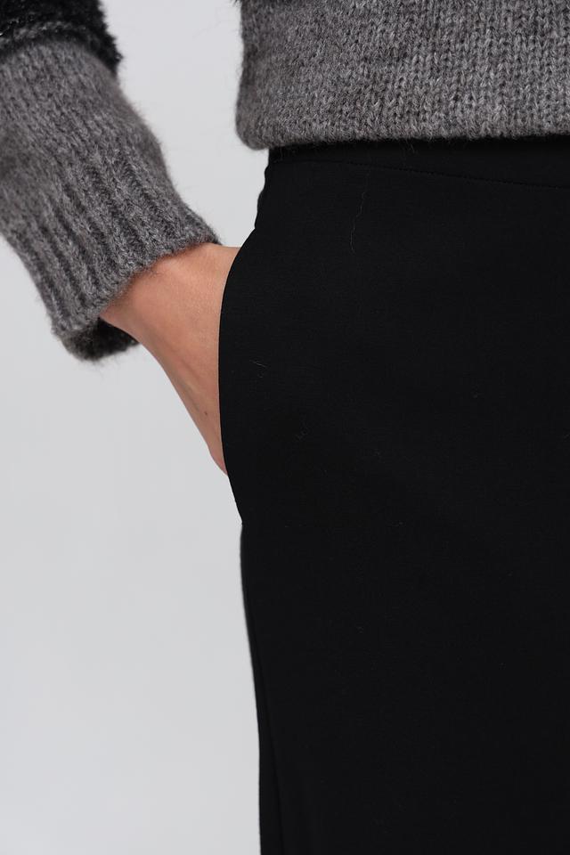 Брюки выполнены из приятной на ощупь ткани, состоящей из вискозы, полиамида и эластана. Сочетание этих материалов обеспечивает комфорт, хорошую посадку и лёгкость в уходе. Прямой крой брюк визуально вытягивает фигуру, а высокая посадка подчеркивает талию.
