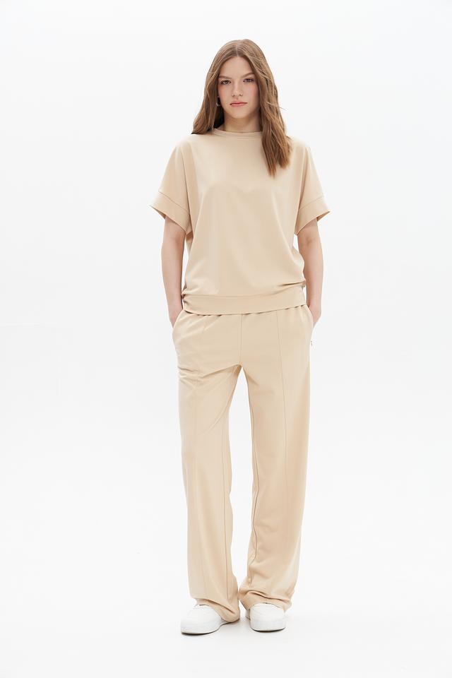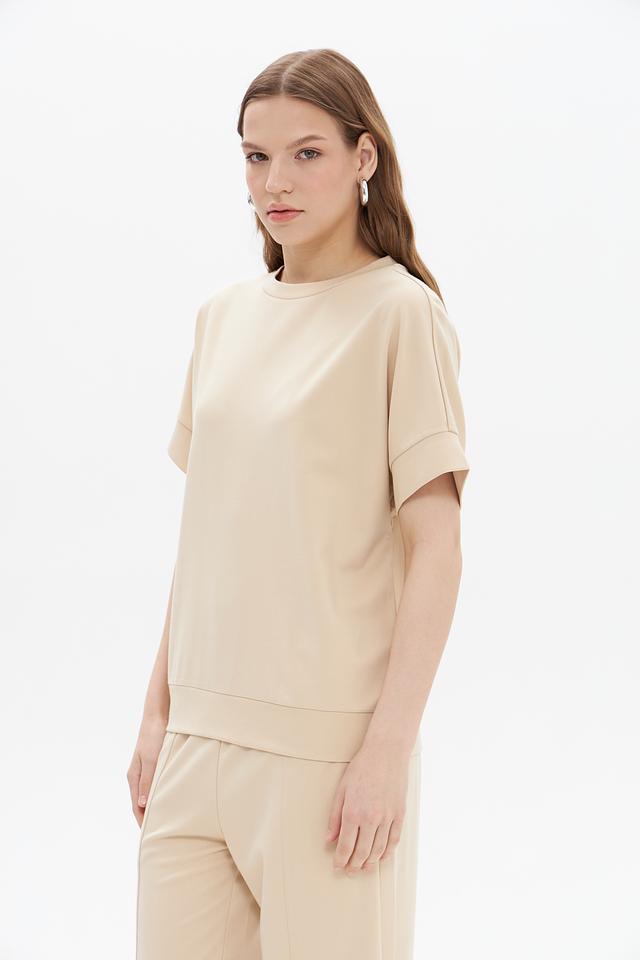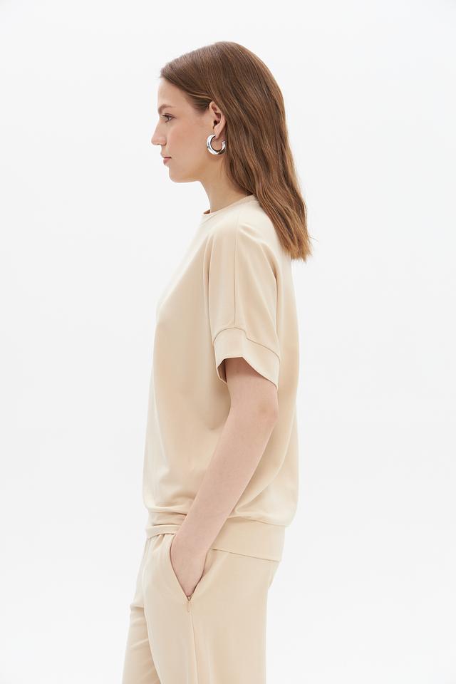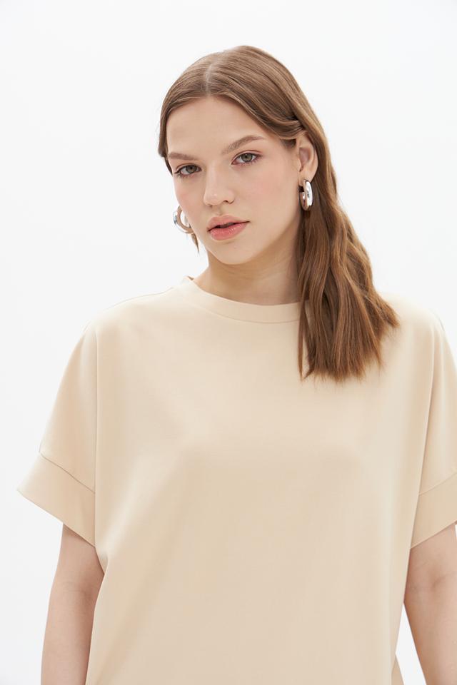 Модель имеет прямой крой и короткий рукав, что делает ее идеальной для теплой погоды или для создания многослойных образов. Круглый вырез горловины подчеркивает элегантность силуэта.