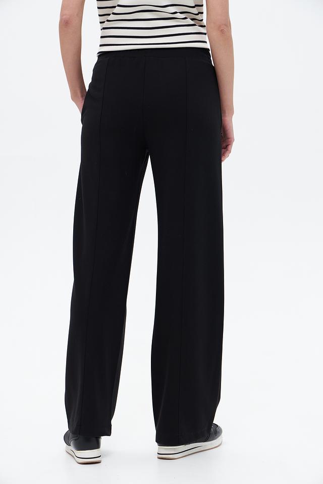 Брюки имеют прямой крой, который визуально удлиняет силуэт, а эластичный пояс обеспечивает удобную посадку. Боковые карманы добавляют функциональности и практичности. Изготовлены из мягкой и приятной к телу ткани, состоящей из вискозы, полиамида и эластана.