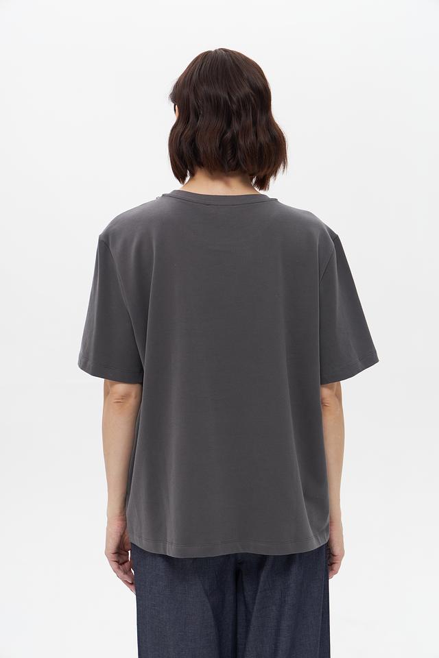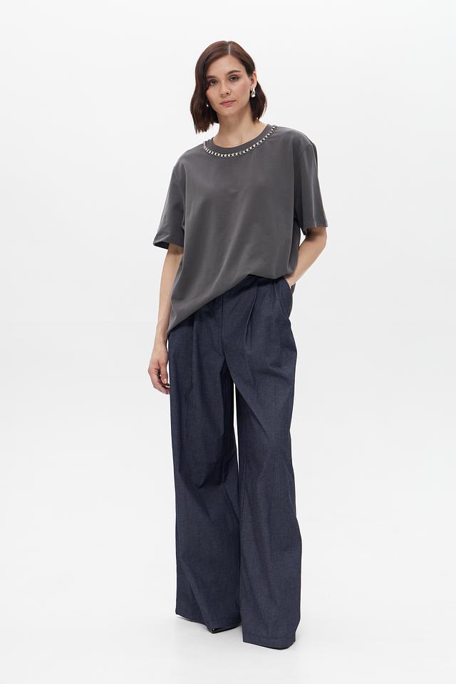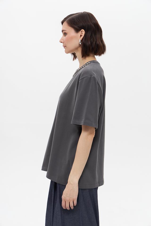 Особенностью данной модели является декоративная цепь, украшающая горловину, придавая образу изысканность и оригинальность. Футболка имеет свободный крой, который не сковывает движения и позволяет создать расслабленный повседневный образ.
