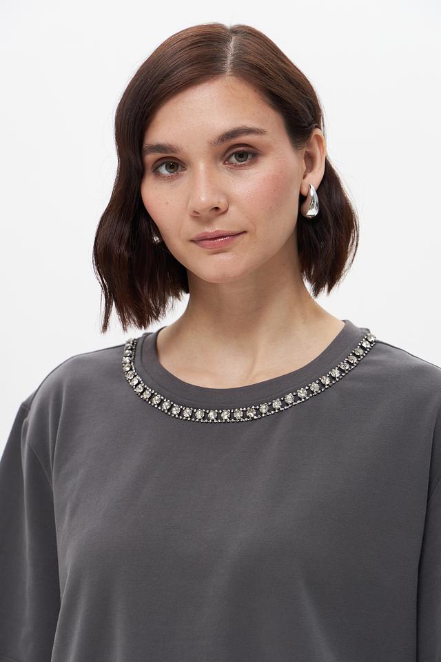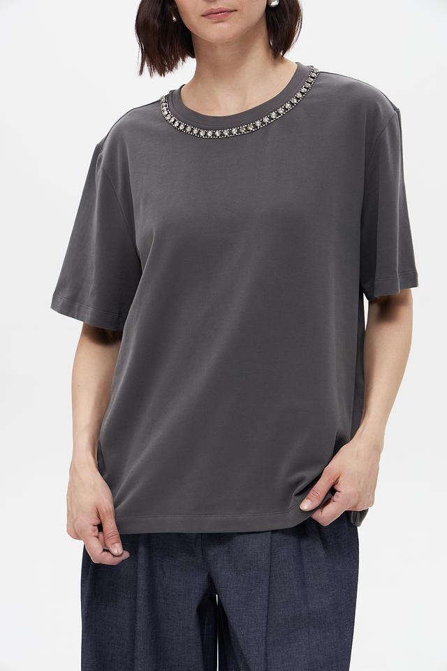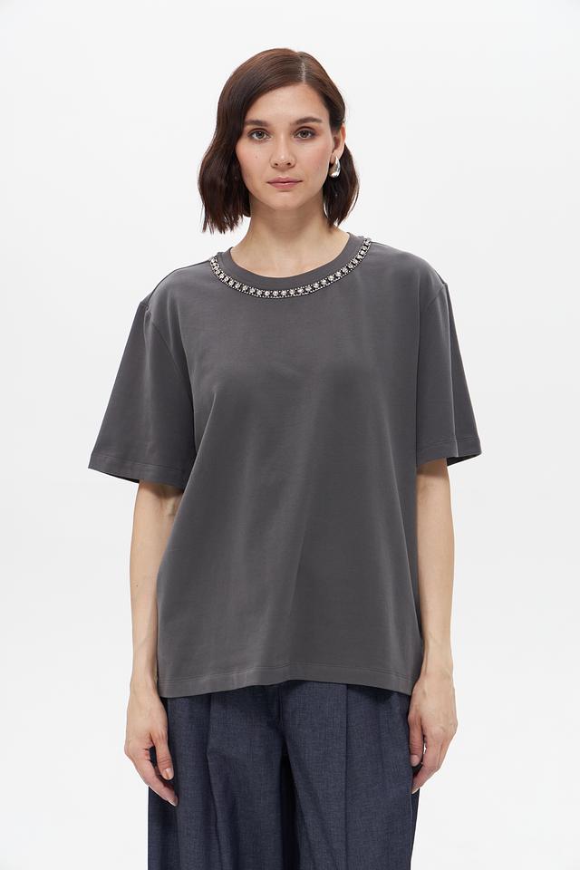 Стильная женская футболка UNQ серого цвета с декоративной цепью на горловине. Изготовлена из мягкого хлопка с добавлением эластана для комфорта и свободы движений. Состав: хлопок 95%, эластан 5%