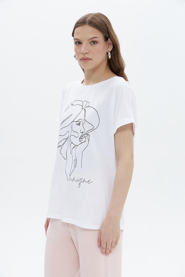 Футболка имеет прямой крой, короткие рукава с небольшим подворотом и круглый вырез горловины. Она идеально подходит для создания повседневных образов в сочетании с джинсами, брюками или юбками.