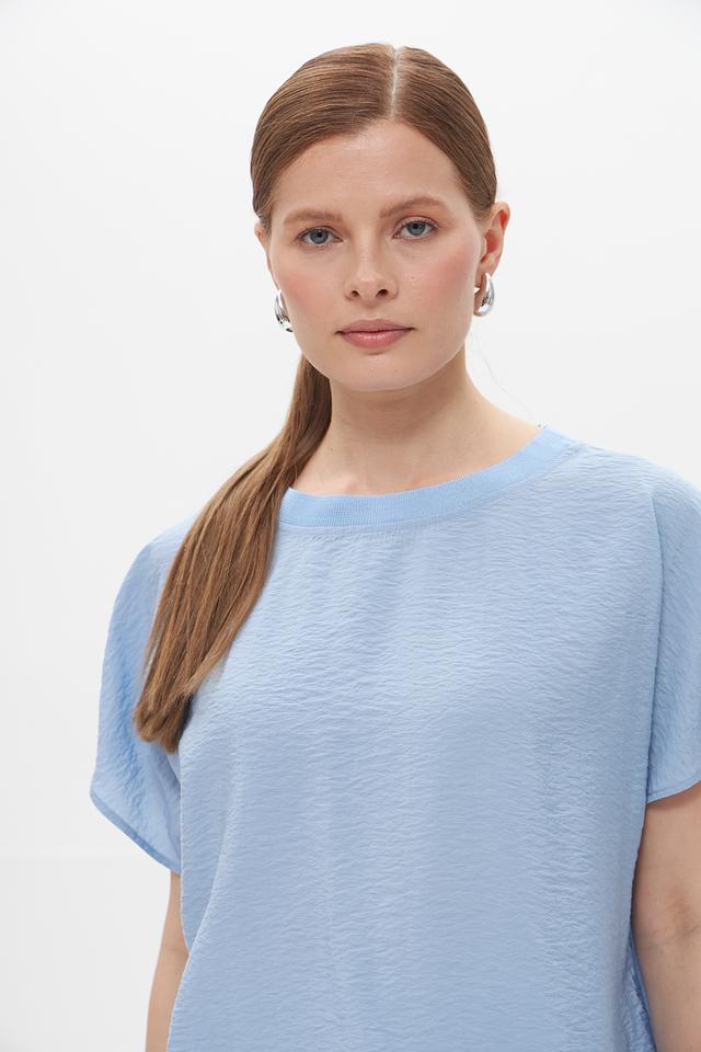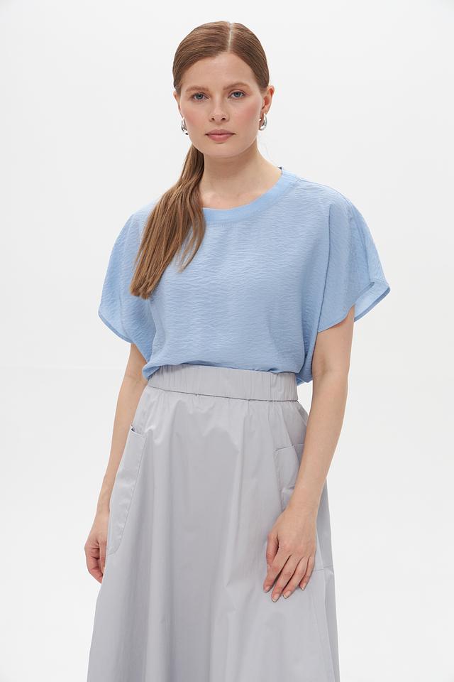 Голубая блузка UNQ из вискозы с короткими рукавами и округлым вырезом. Изделие выполнено из мягкой и приятной к телу ткани, обеспечивающей комфорт в носке. Состав: 85% вискоза, 15% полиэстер. Состав: вискоза 85%, полиэстер 15%