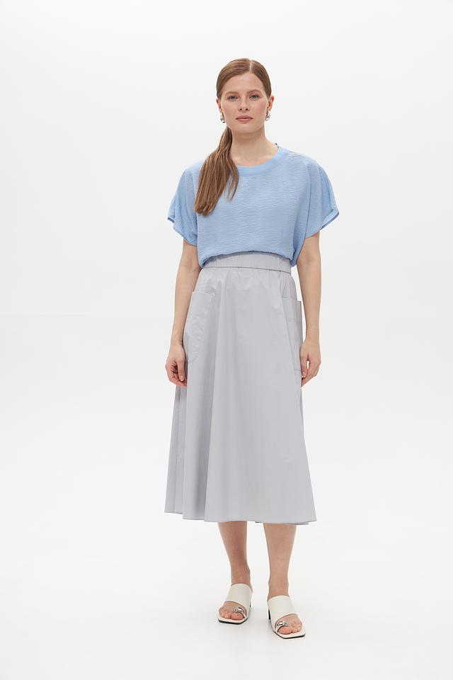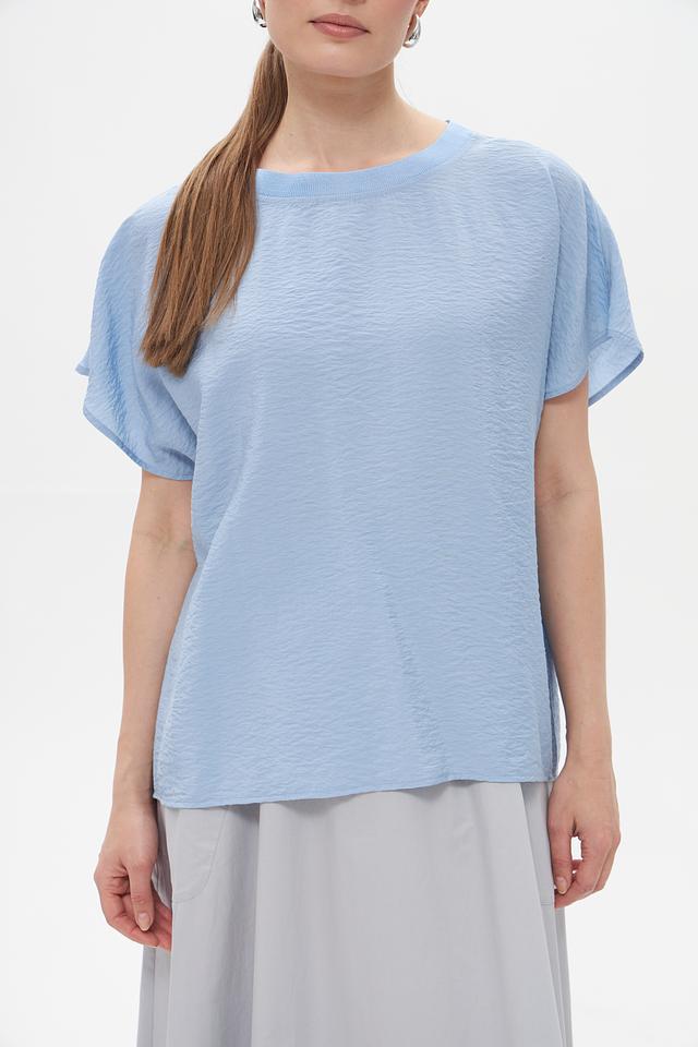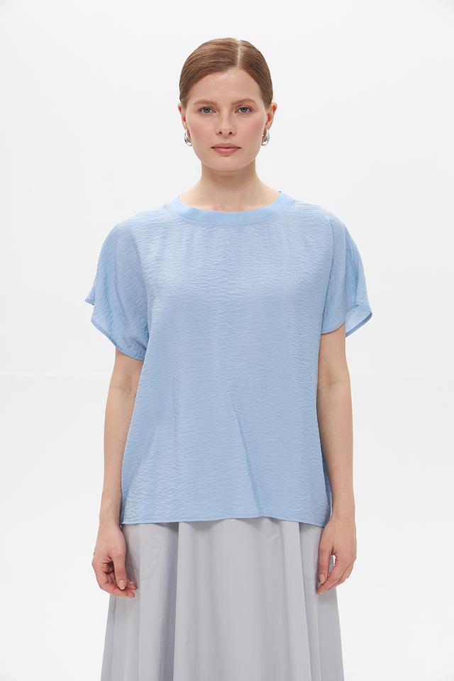 Модель имеет свободный крой, что обеспечивает комфорт при носке. Короткие рукава и округлый вырез делают блузку универсальной и подходящей для различных случаев.