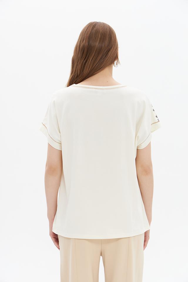 Кремовый цвет футболки легко сочетается с различными элементами одежды, позволяя создавать разнообразные образы – от повседневных до более нарядных. Эта футболка идеально подойдет для прогулок, встреч с друзьями или работы.