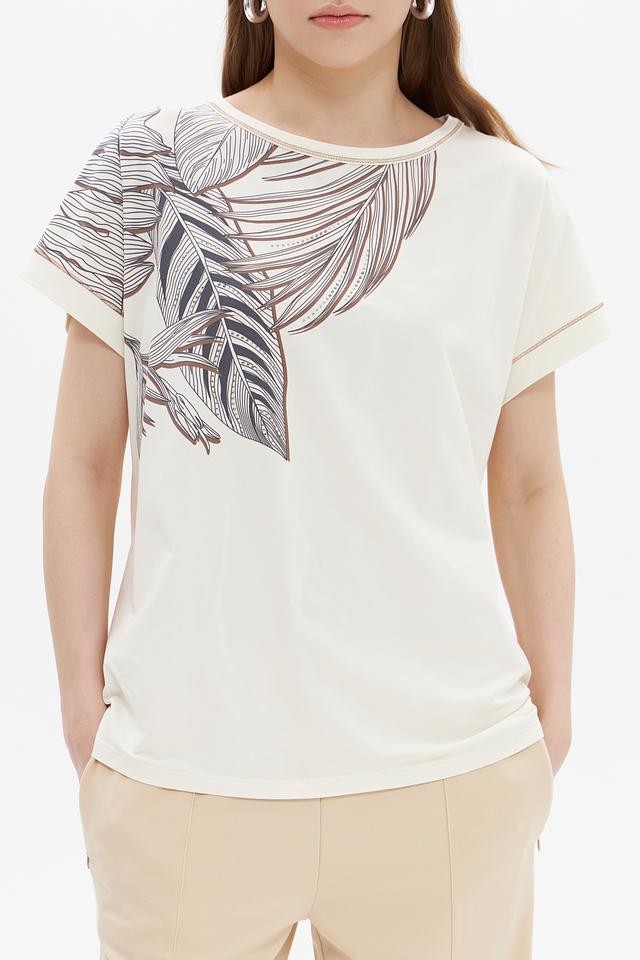 Женская футболка UNQ кремового цвета с оригинальным принтом в виде листьев. Изготовлена из мягкого хлопка с добавлением эластана для комфорта и лучшей посадки. Состав: хлопок 92%, эластан 8%