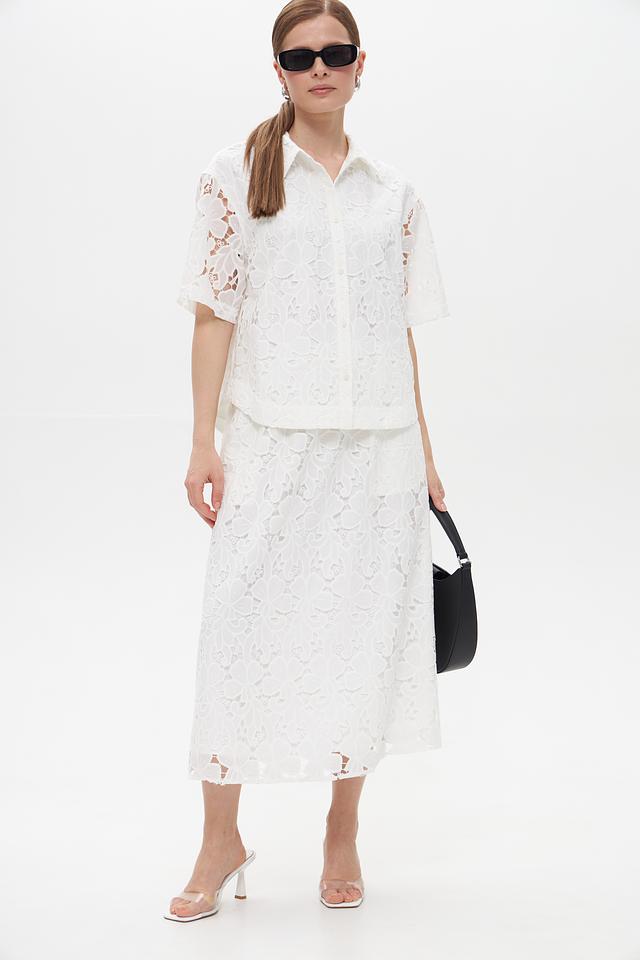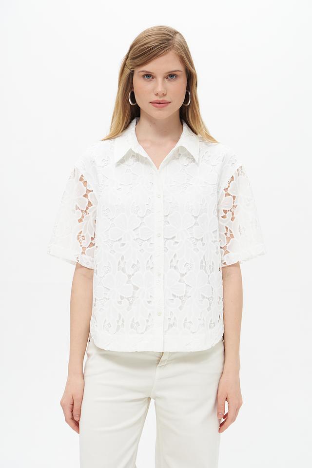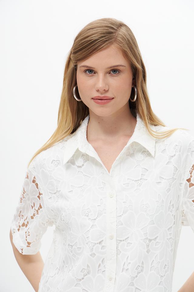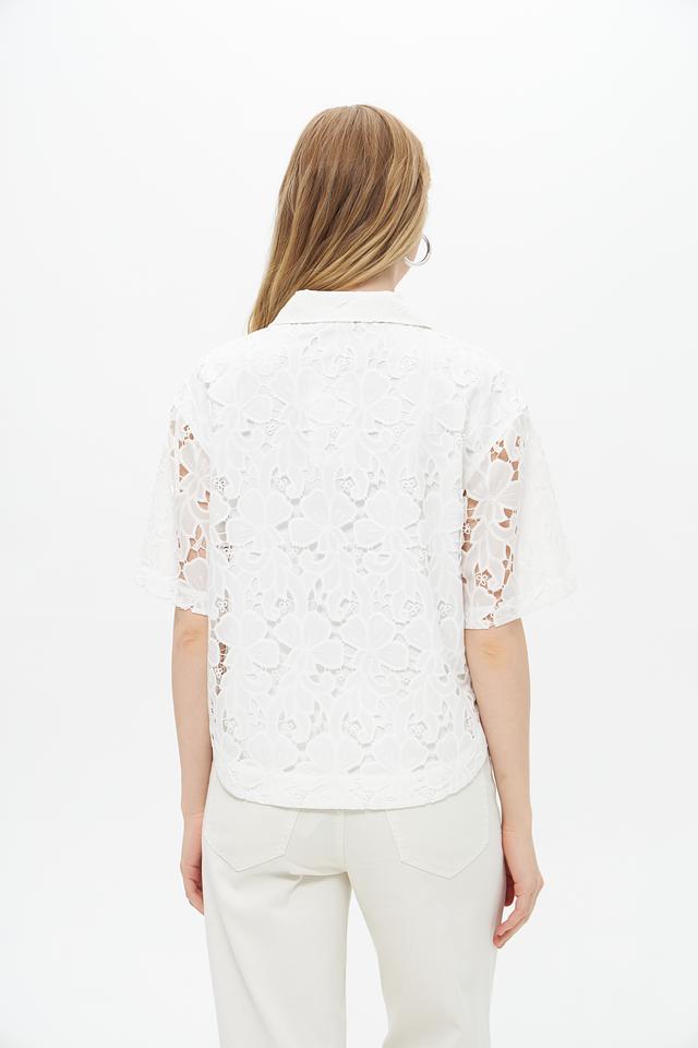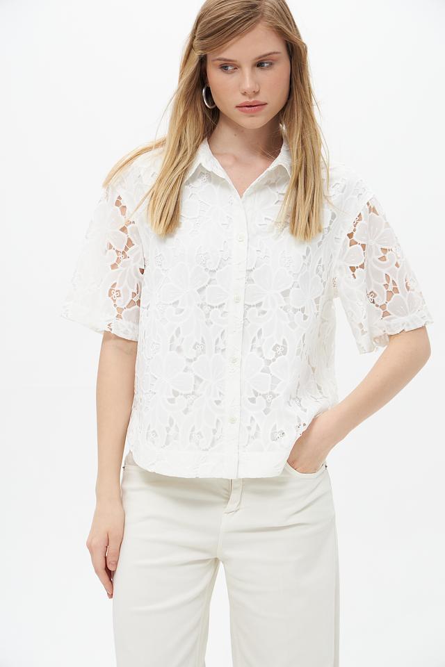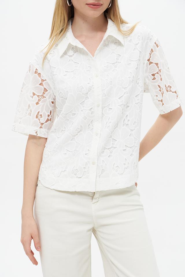 Белая блуза UNQ из полиэстера с ажурным кружевом. Эта модель с короткими рукавами и классическим воротником станет отличным дополнением к вашему гардеробу. Состав: полиэстер 100%