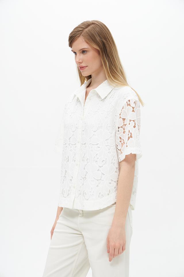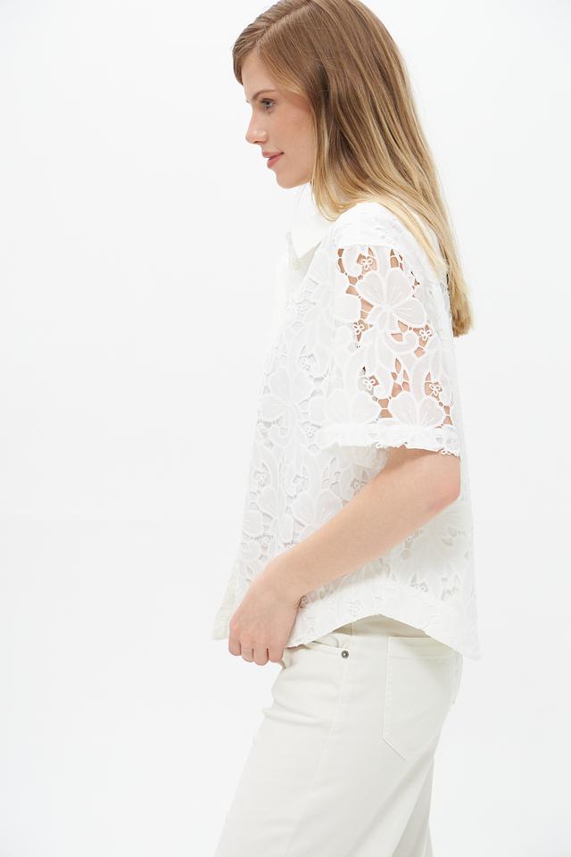 Особенностью данной модели является ажурное кружево, которое придает ей изысканность и женственность. Классический воротник и короткие рукава делают блузу подходящей для повседневной носки, а также для более формальных мероприятий.