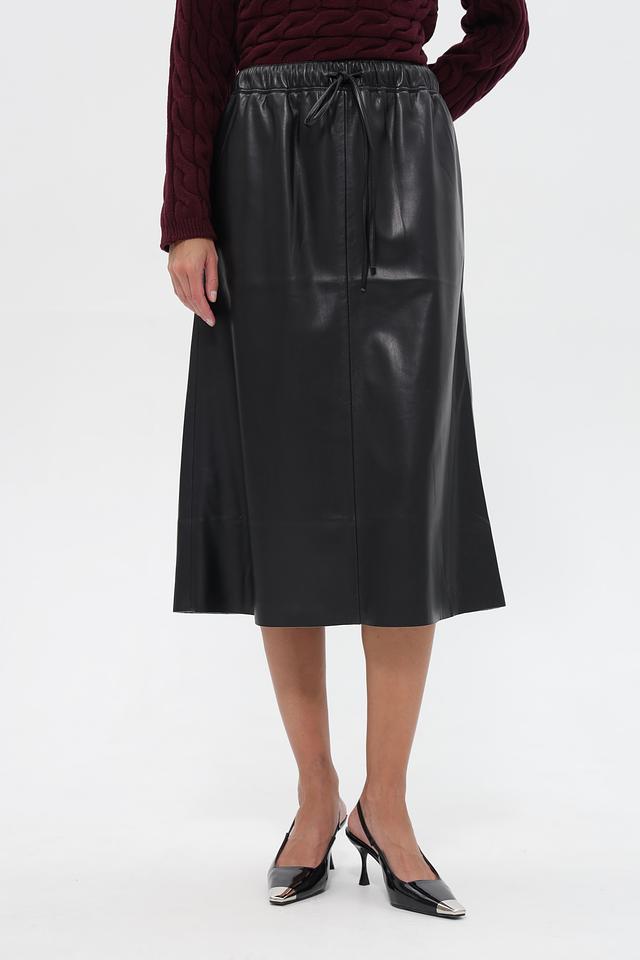 Юбка имеет классический чёрный цвет и длину миди. Эластичный пояс обеспечивает комфортную посадку по фигуре, а боковые завязки добавляют акцент и позволяют регулировать облегание.