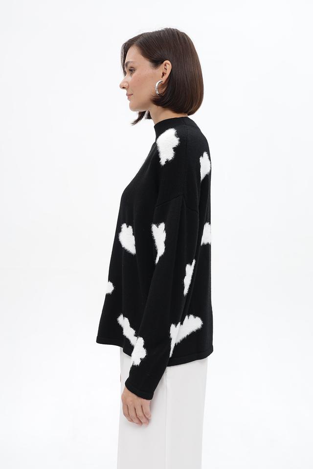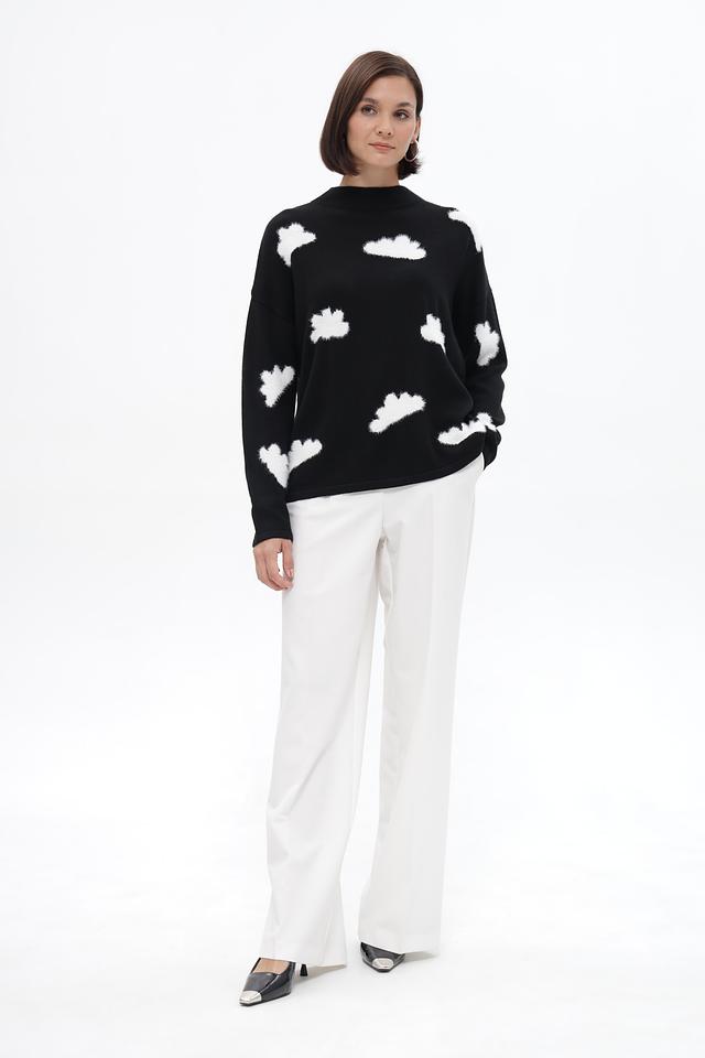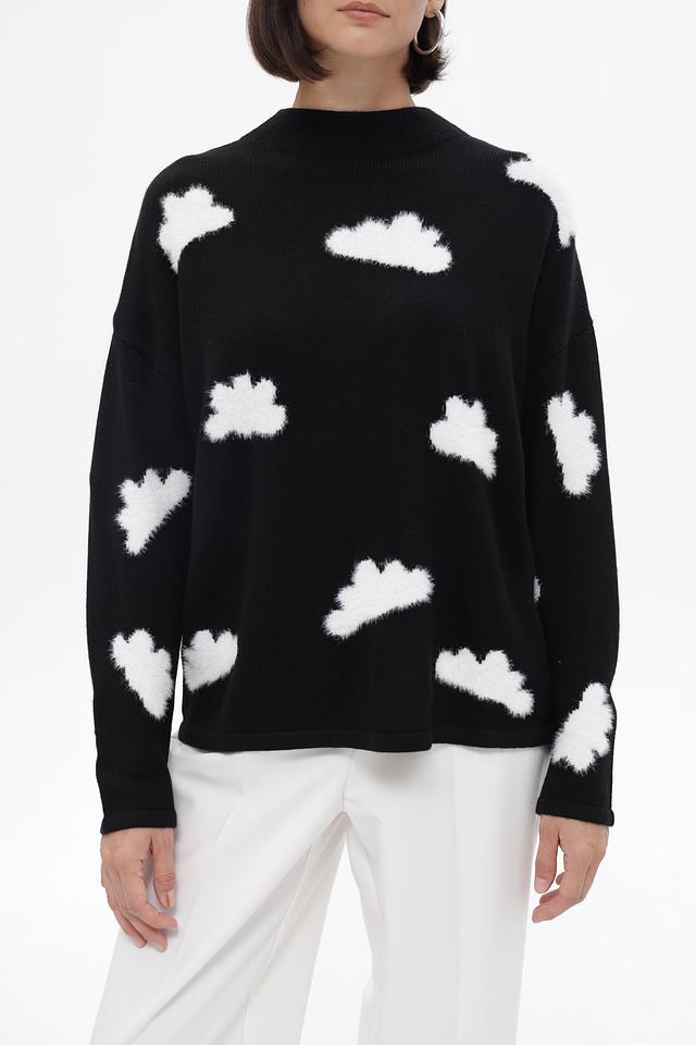 Чёрный пуловер от UNQ с оригинальным принтом в виде белых облаков. Изготовлен из мягкой смеси шерсти, полиакрила и полиамида, обеспечивающей комфорт и тепло. Идеально подходит для создания уютных и стильных образов. Состав: шерсть 44%, полиакрил 44%, полиамид 12%