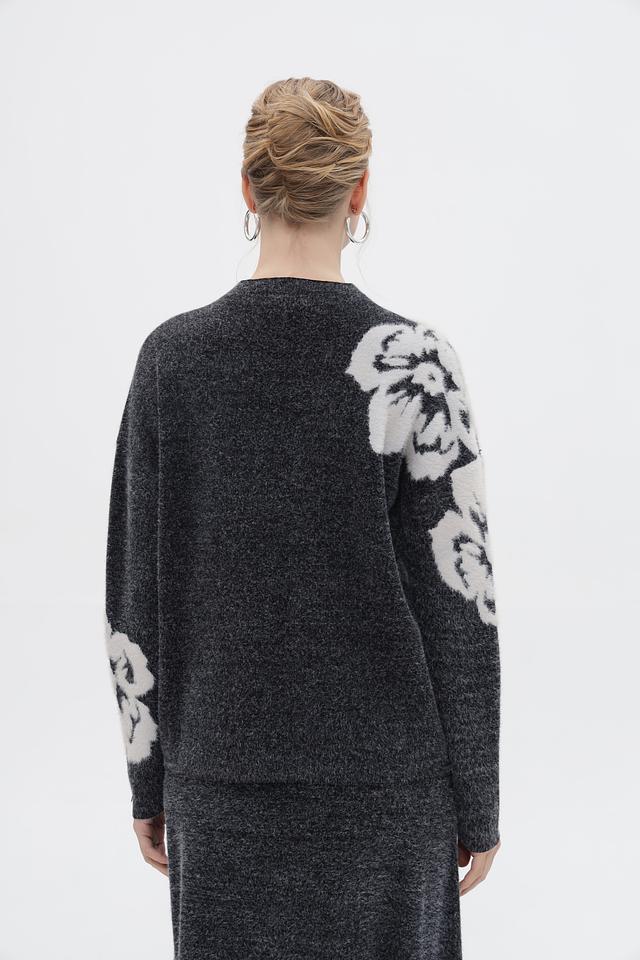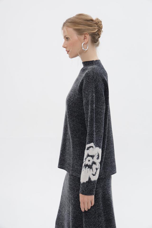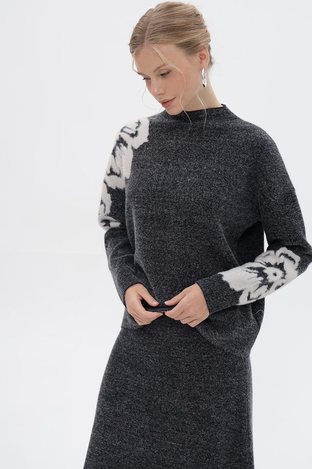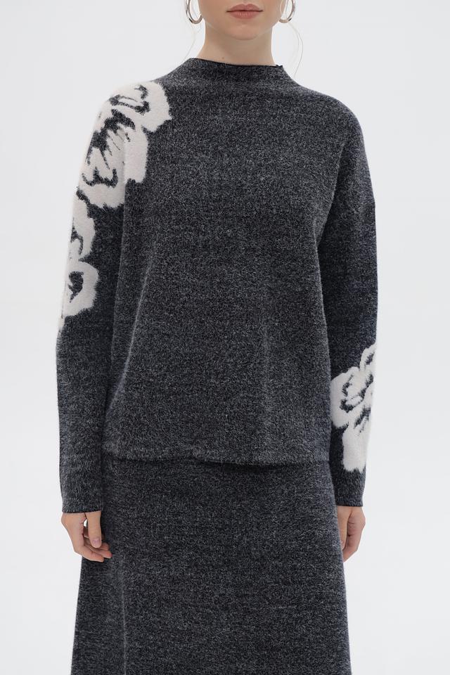 Пуловер имеет свободный крой и круглый вырез горловины. Основной цвет изделия – серый меланж, который отлично сочетается с белым цветочным принтом, расположенным на рукавах. Принт выполнен в виде крупных, абстрактных цветов, добавляющих образу оригинальность и выразительность.
