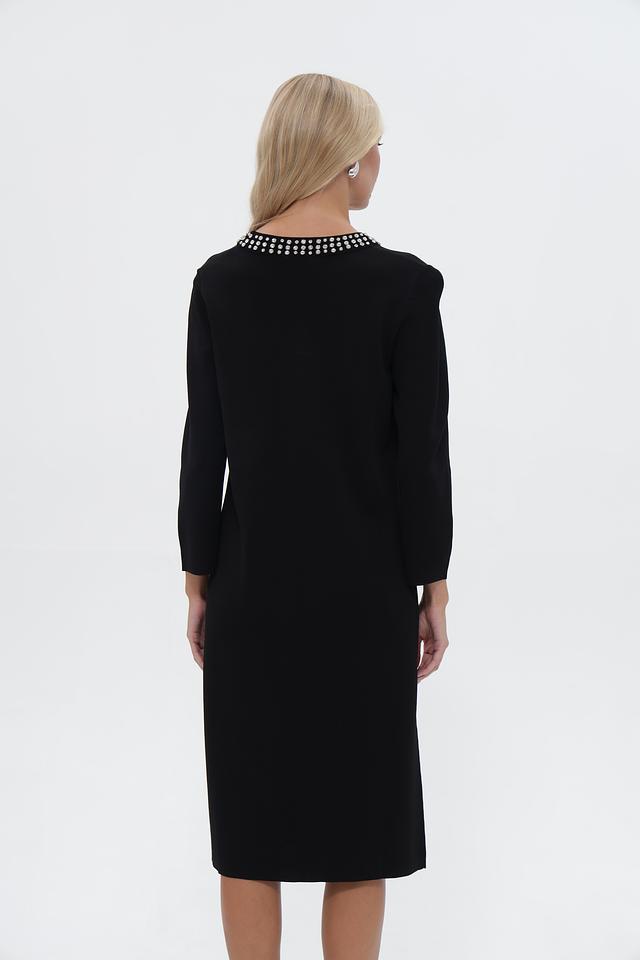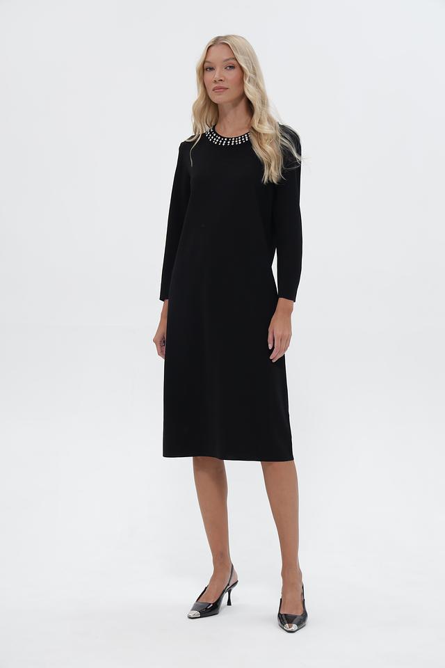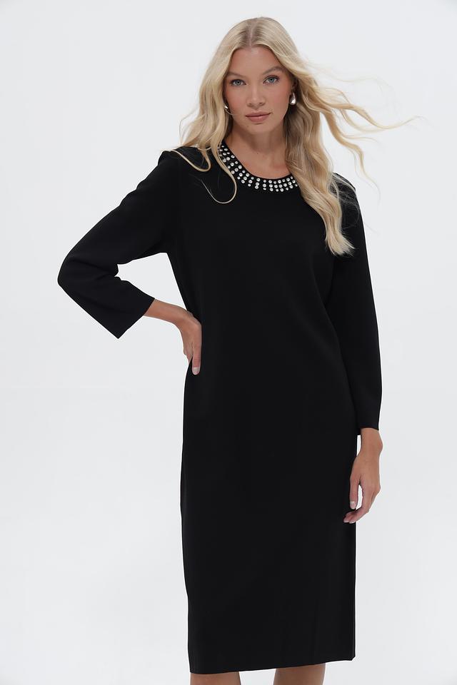 Чёрное платье UNQ длиной миди с округлым вырезом, украшенным жемчужным декором. Изготовлено из вискозы с добавлением нейлона для комфорта и износостойкости. Состав: вискоза 80%, нейлон 20%