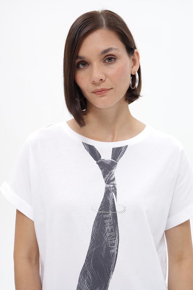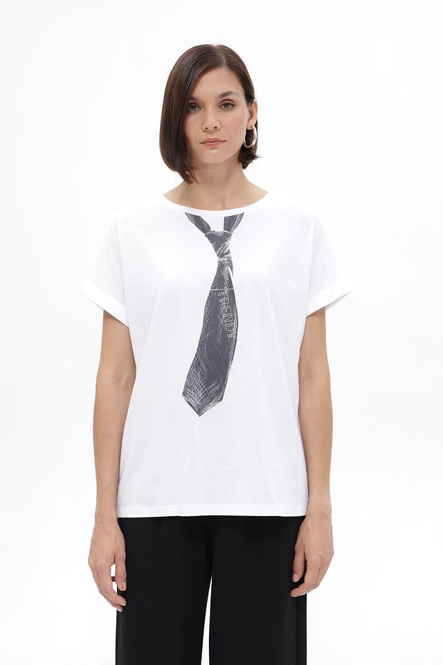 Особенностью данной футболки является оригинальный принт в виде галстука, который добавляет образу нотку индивидуальности и стиля. Футболка имеет круглый вырез горловины, что делает ее универсальной для различных типов фигуры.