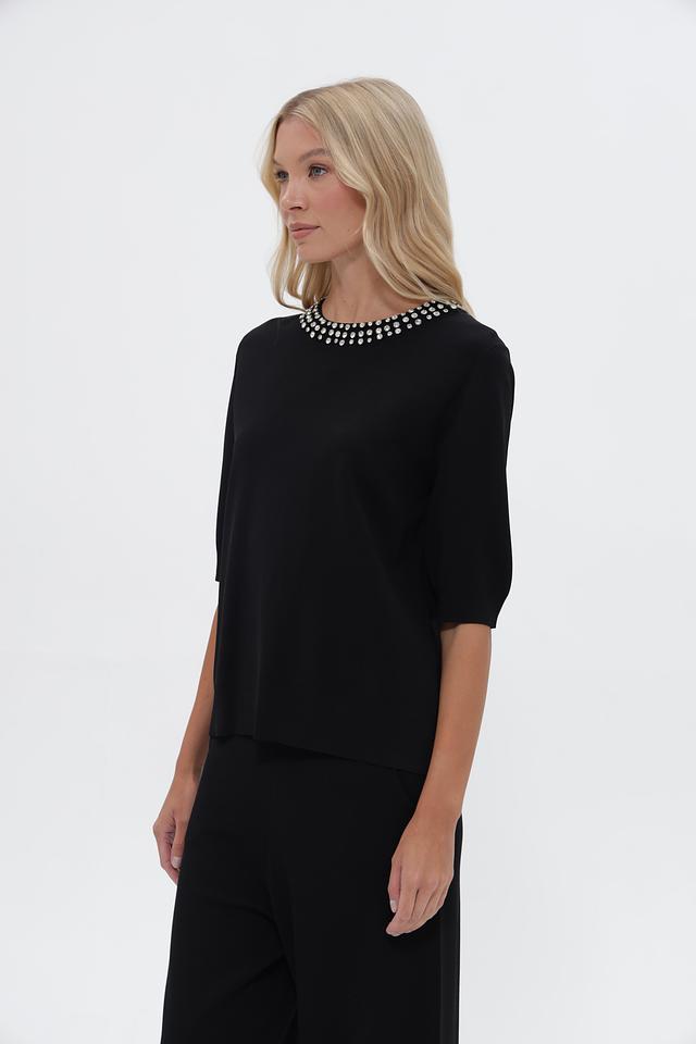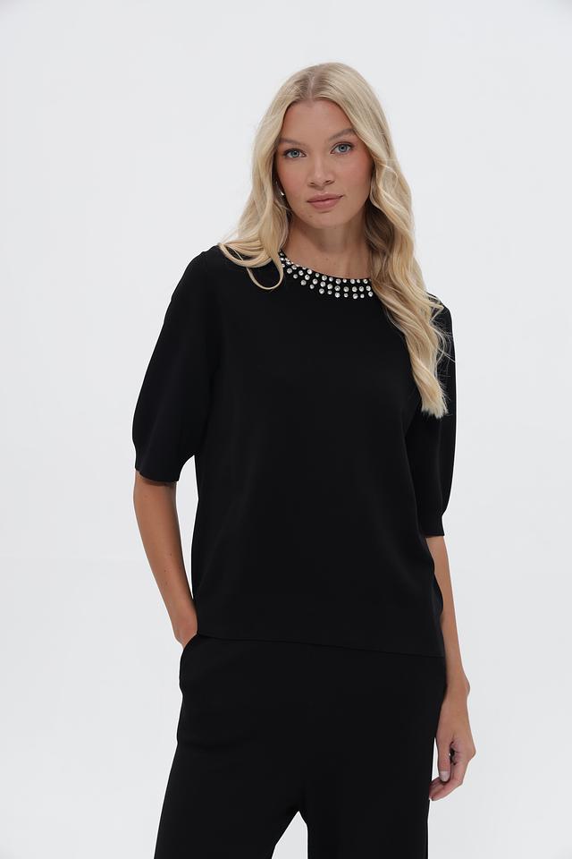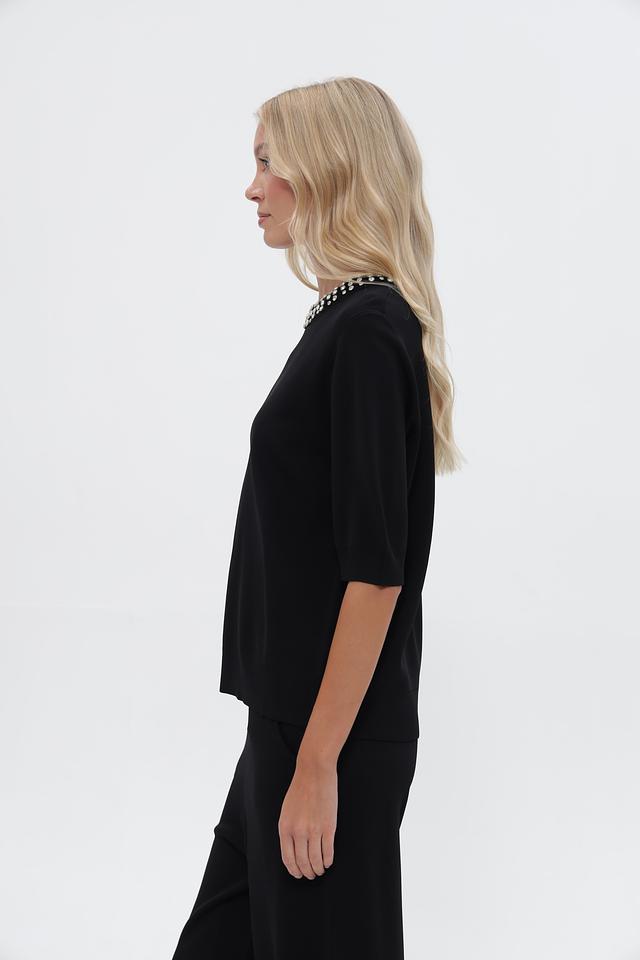 Чёрный пуловер от UNQ с изящным декором из бусин на горловине. Изготовлен из вискозы с добавлением полиамида для комфорта и лучшей посадки. Подчеркнёт ваш стиль и добавит элегантности образу. Состав: вискоза 80%, полиамид 20%