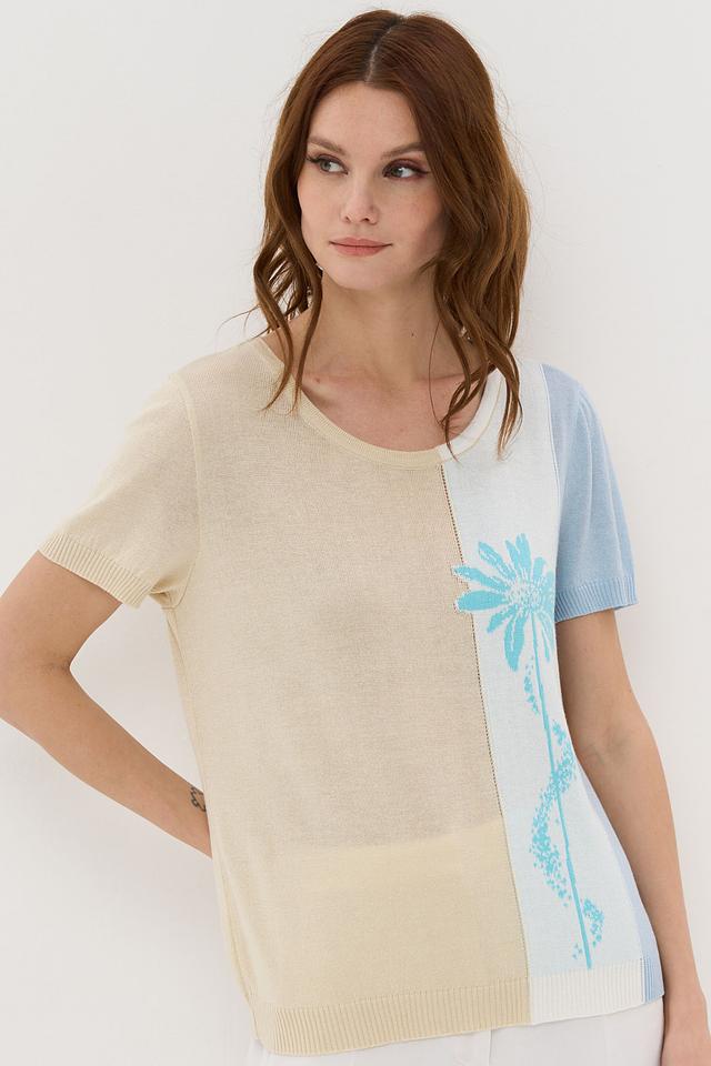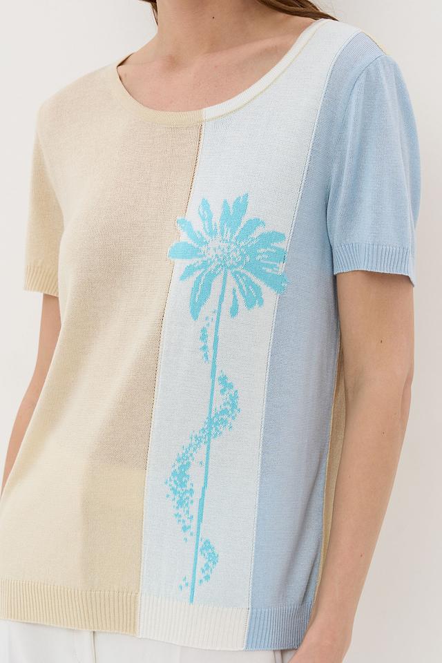 Передняя часть джемпера украшена ярким цветочным принтом, который добавляет образу оригинальности и женственности. Округлый вырез горловины и короткие рукава делают этот джемпер идеальным для теплой погоды.