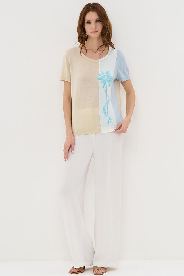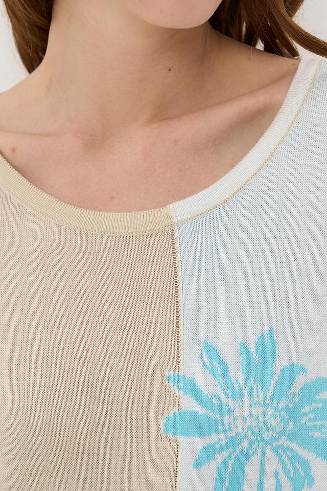 Женский джемпер VAY бежевого и голубого цвета с ярким цветочным принтом. Короткий рукав и округлый вырез делают этот джемпер отличным выбором для создания стильного и комфортного образа. Состав: