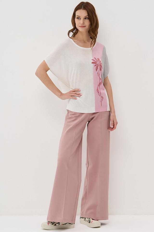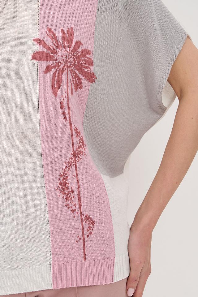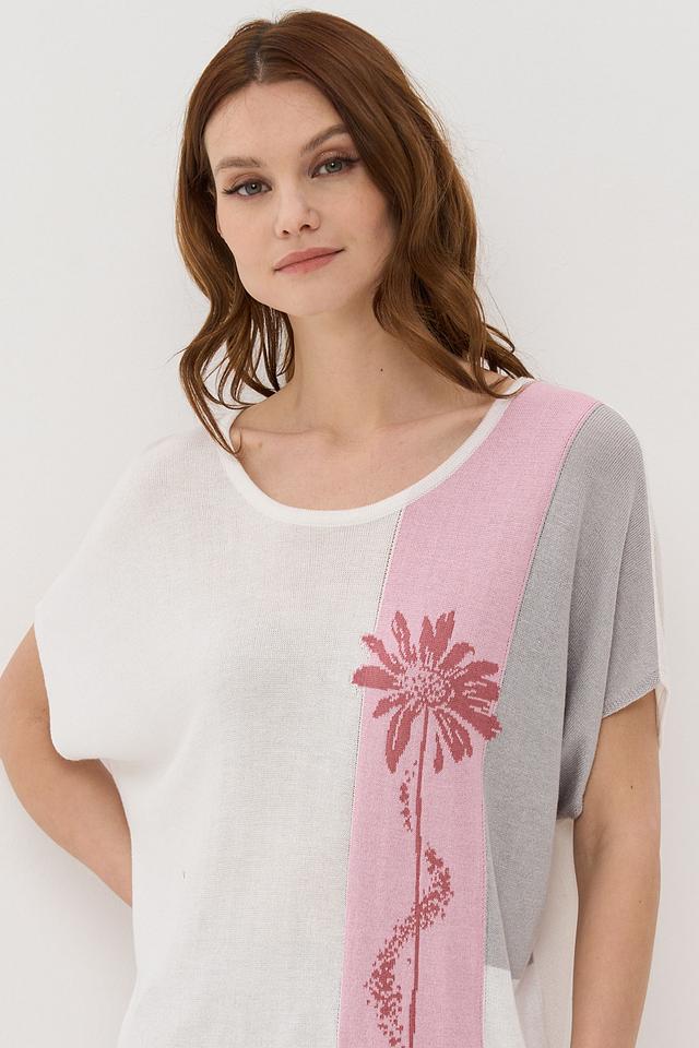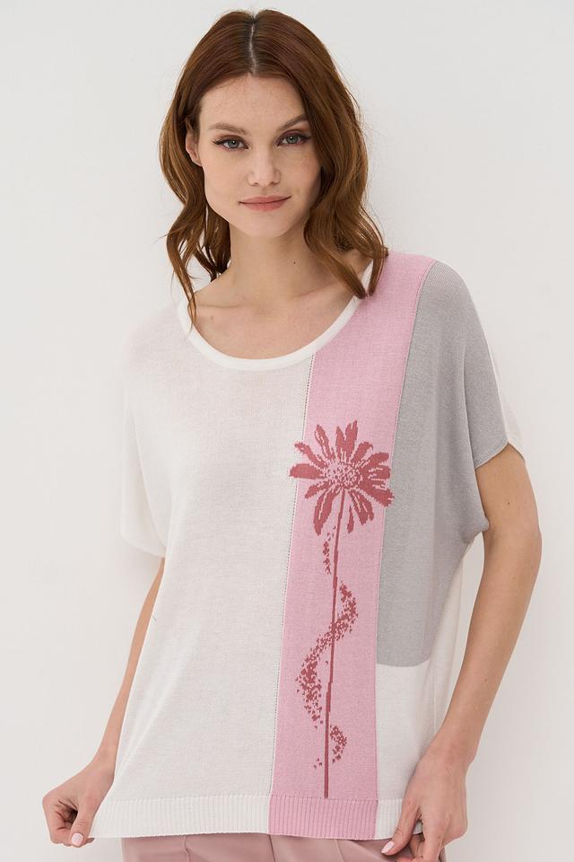 Женский джемпер VAY нежно-розового, серого и бежевого цвета с цветочным принтом. Модель выполнена из мягкого трикотажа с короткими рукавами и округлым вырезом горловины. Состав: