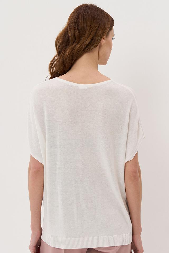 Джемпер украшен ярким цветочным принтом, который добавляет ему женственности и оригинальности. Короткие рукава и округлый вырез горловины обеспечивают комфорт и свободу движений.