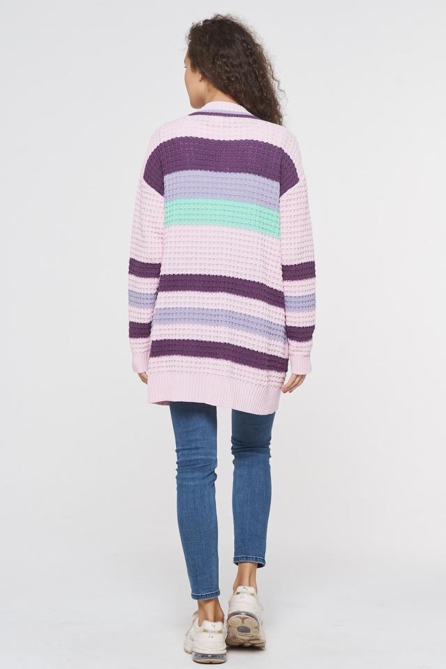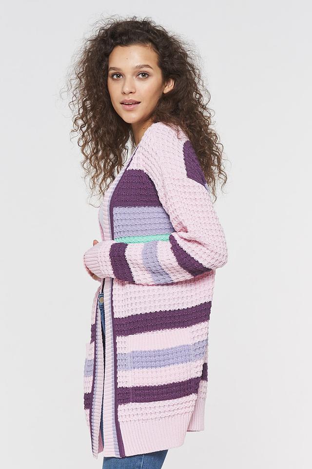 Этот кардиган от VAY – идеальный выбор для создания уютных и стильных образов. Он выполнен в нежно-розовой цветовой гамме и украшен ярким полосатым узором, состоящим из лавандовых, фиолетовых и мятных полос.