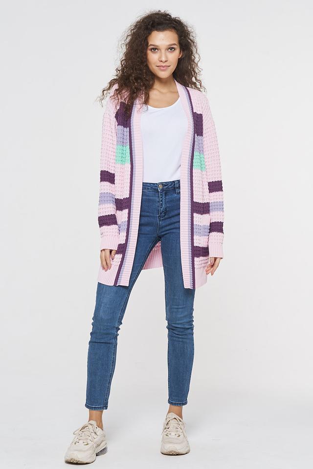 Женский кардиган VAY нежно-розового цвета с ярким полосатым узором станет стильным дополнением к вашему гардеробу. Модель выполнена из мягкого и приятного к телу трикотажа, обеспечивающего комфорт в носке. Состав: хлопок 50%, пан 50%