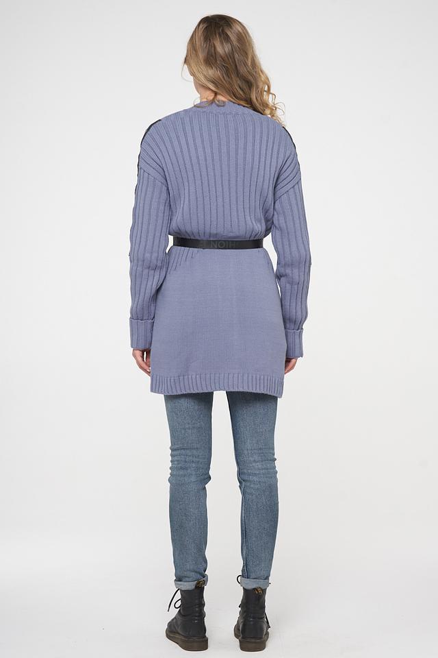 Кардиган имеет свободный крой, V-образный вырез и застегивается на крупные пуговицы. Декоративные вязаные вставки на плечах придают модели оригинальность и стиль.