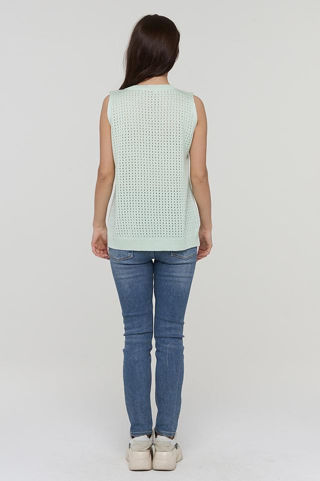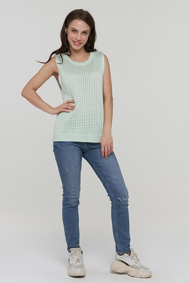 Женский жилет VAY мятного цвета выполнен из лёгкого трикотажа с ажурной вязкой. Модель без рукавов с округлым вырезом горловины станет отличным дополнением к летнему гардеробу. Состав: вискоза 50%, пан 30%, хлопок 20%