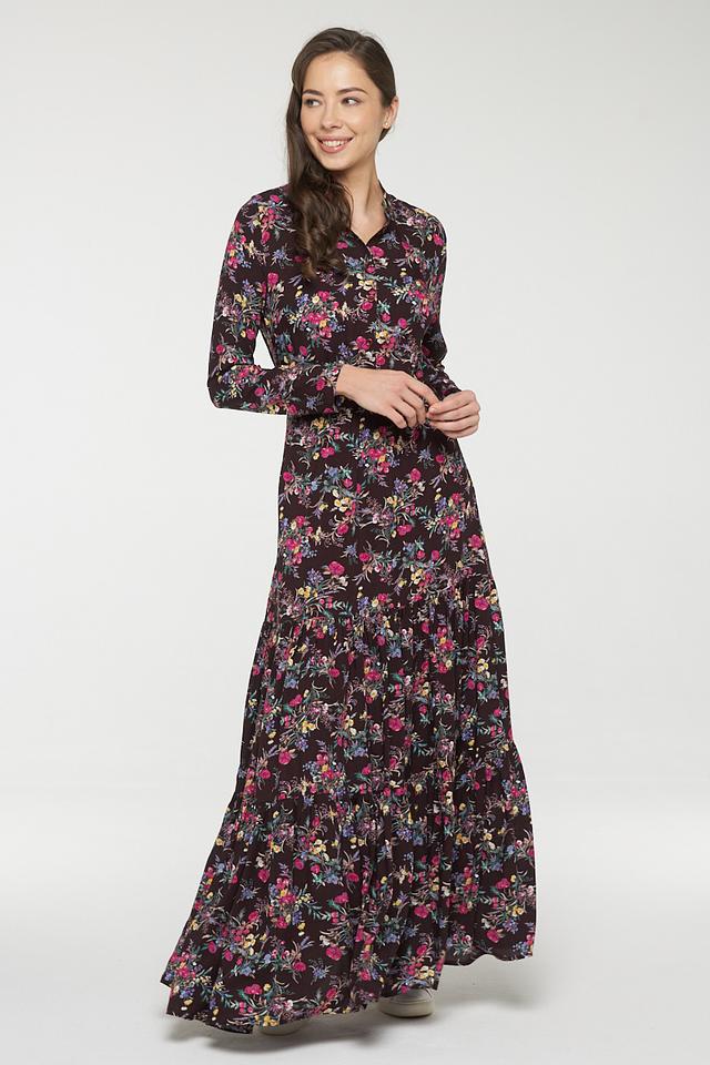Особенностью этого платья является яркий цветочный принт на темно-сливовом фоне. Он добавляет образу легкости и романтичности. Платье идеально подойдет для создания как повседневных, так и вечерних образов.