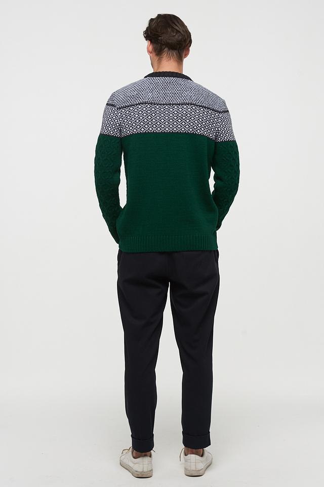 Джемпер VAY – это стильное и практичное решение для создания комфортного образа. Модель выполнена в зелёном цвете и украшена геометрическим жаккардовым узором на плечах, выполненным в белых и тёмно-синих тонах.