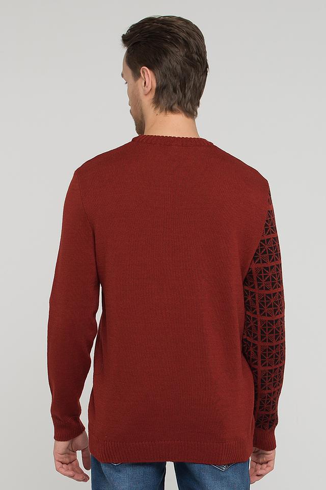 Этот стильный мужской джемпер от VAY станет отличным дополнением к вашему гардеробу. Выполненный в насыщенном бордовом цвете, он привлекает внимание своим оригинальным жаккардовым узором, расположенным на рукавах и груди.