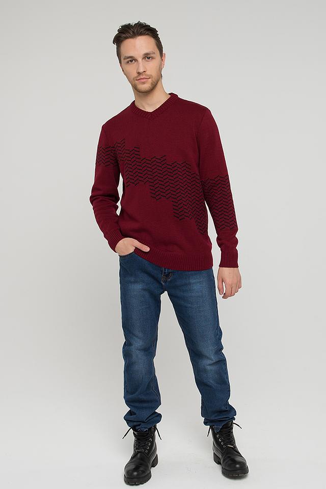 Модель имеет V-образный вырез и длинные рукава. Передняя часть джемпера украшена выразительным геометрическим узором тёмно-бордового цвета, который придает изделию оригинальность.